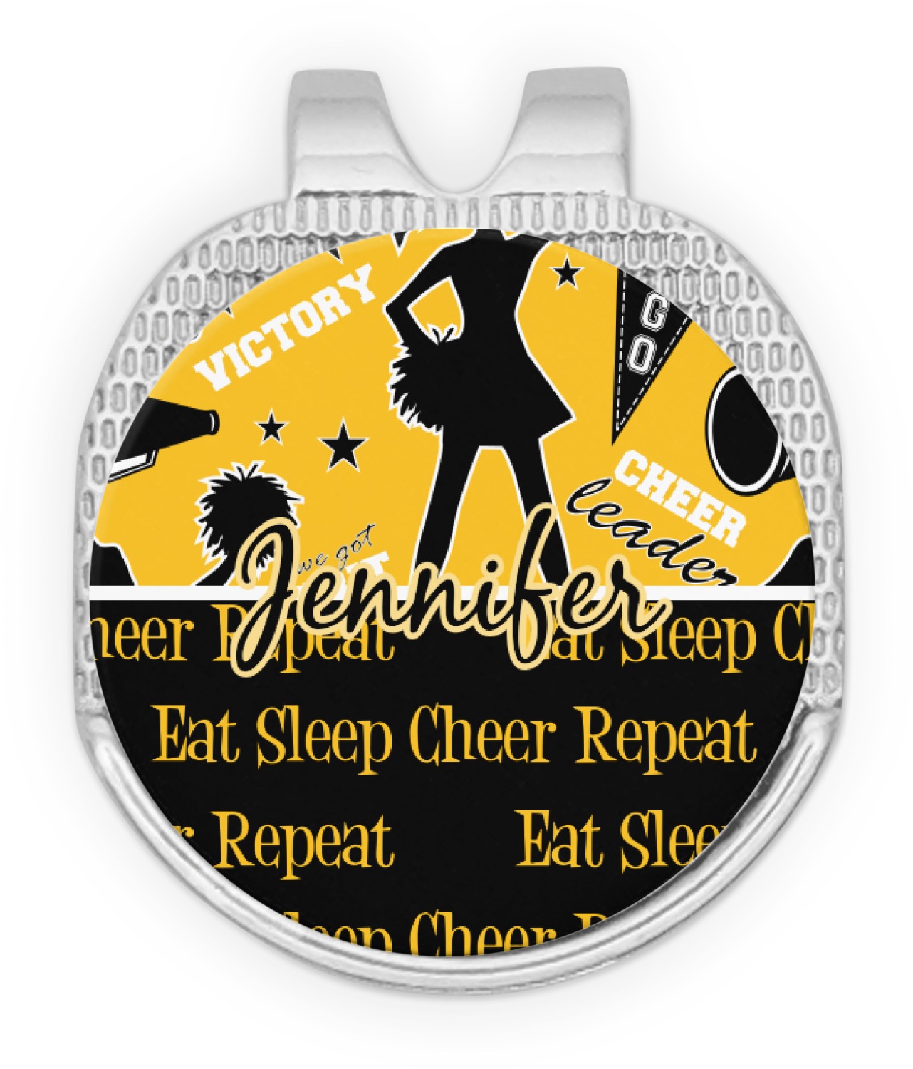 This design is a fun combo with a bright yellow and black. The two colors are a great contrast to one another. The top half of the design has a cheerleader sillhouette as well as words like "cheerleader" and "victory." The bottom half has a background that says eat, sleep, cheer, repeat. Your personalization goes right in between these two backgrounds right in the middle.