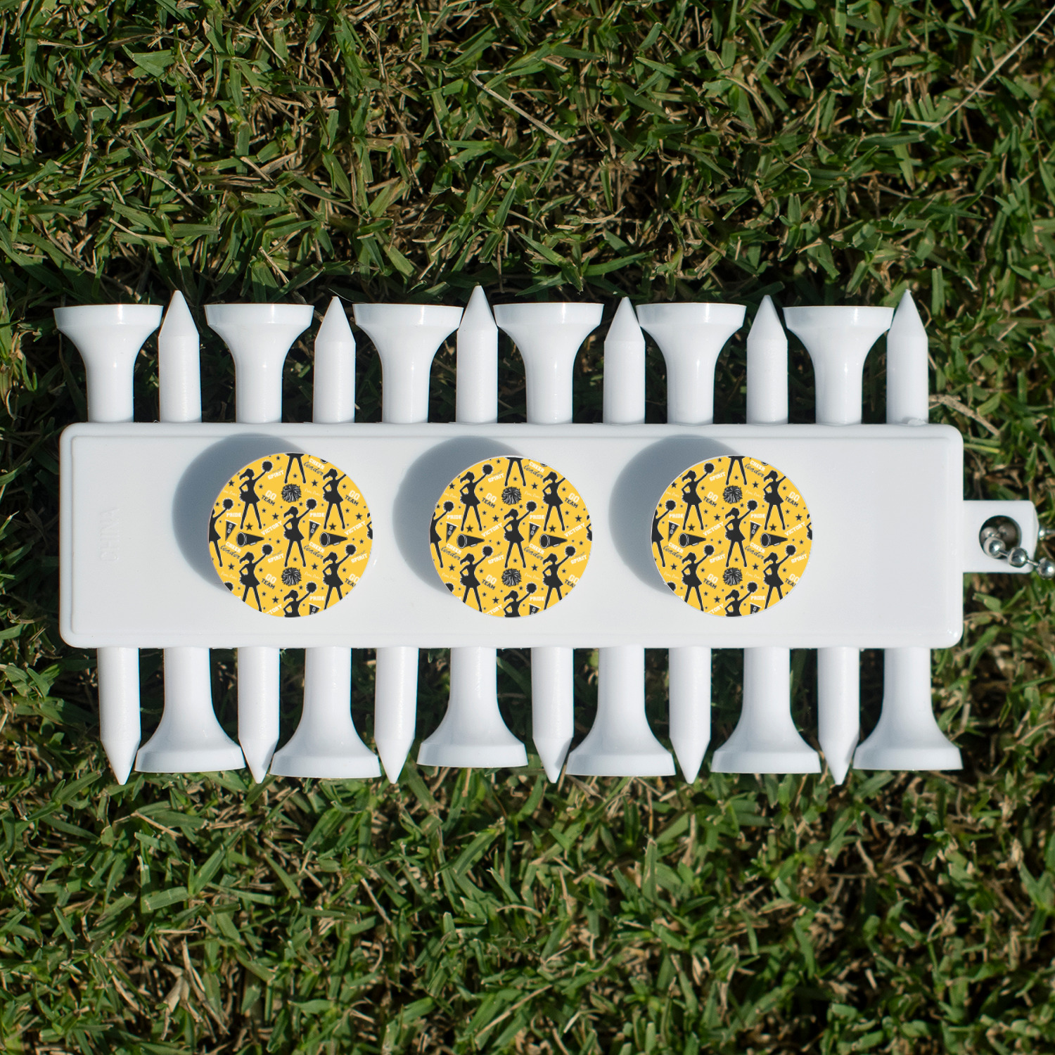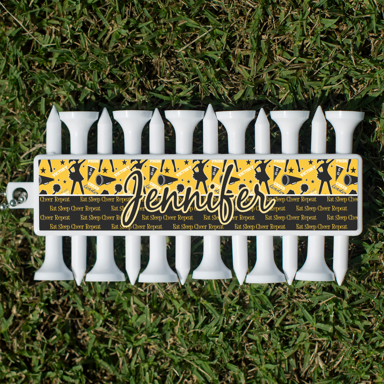 This design is a fun combo with a bright yellow and black. The two colors are a great contrast to one another. The top half of the design has a cheerleader sillhouette as well as words like "cheerleader" and "victory." The bottom half has a background that says eat, sleep, cheer, repeat. Your personalization goes right in between these two backgrounds right in the middle.