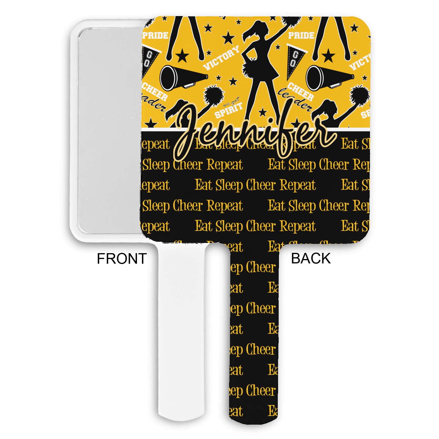 This design is a fun combo with a bright yellow and black. The two colors are a great contrast to one another. The top half of the design has a cheerleader sillhouette as well as words like "cheerleader" and "victory." The bottom half has a background that says eat, sleep, cheer, repeat. Your personalization goes right in between these two backgrounds right in the middle.