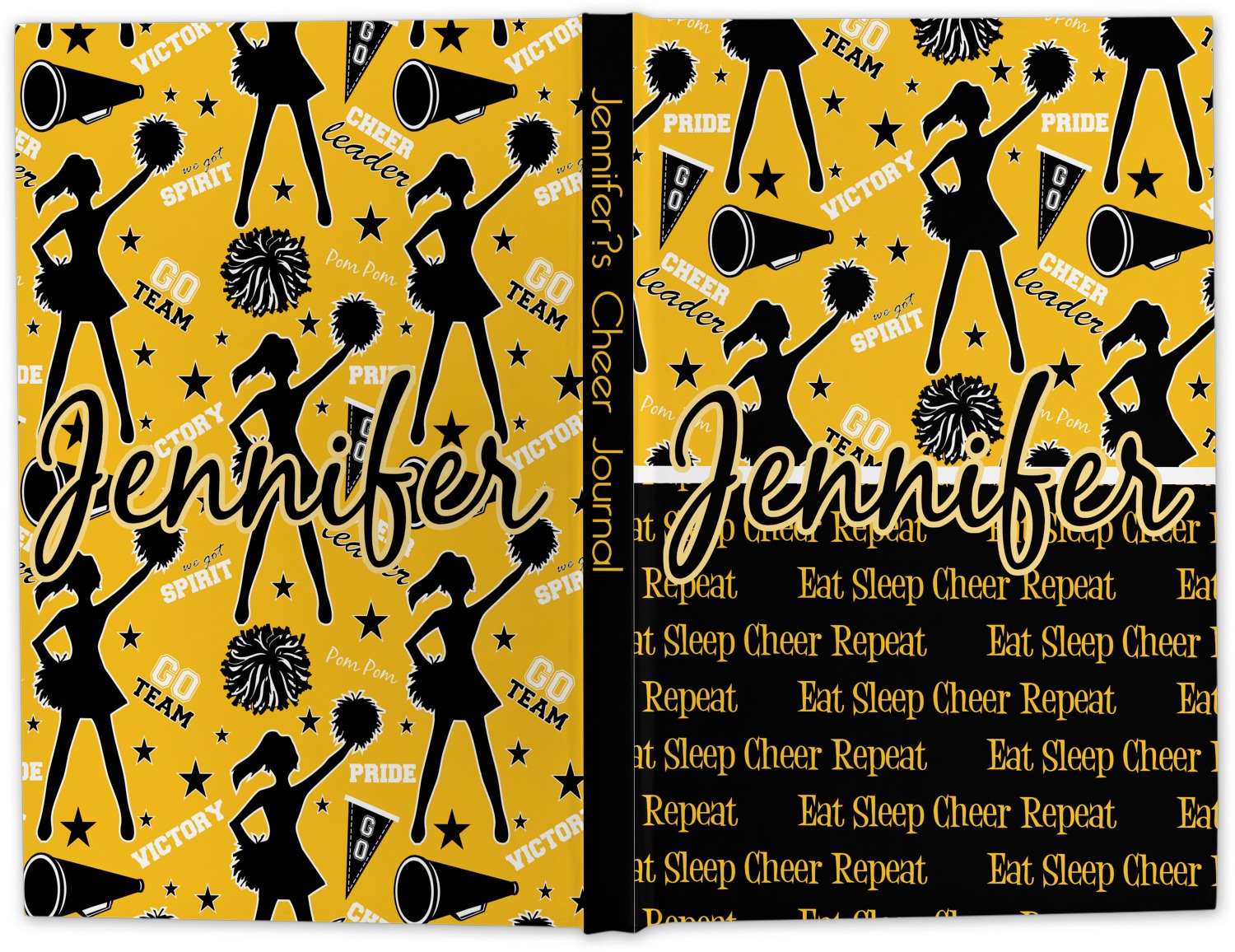 This design is a fun combo with a bright yellow and black. The two colors are a great contrast to one another. The top half of the design has a cheerleader sillhouette as well as words like "cheerleader" and "victory." The bottom half has a background that says eat, sleep, cheer, repeat. Your personalization goes right in between these two backgrounds right in the middle.