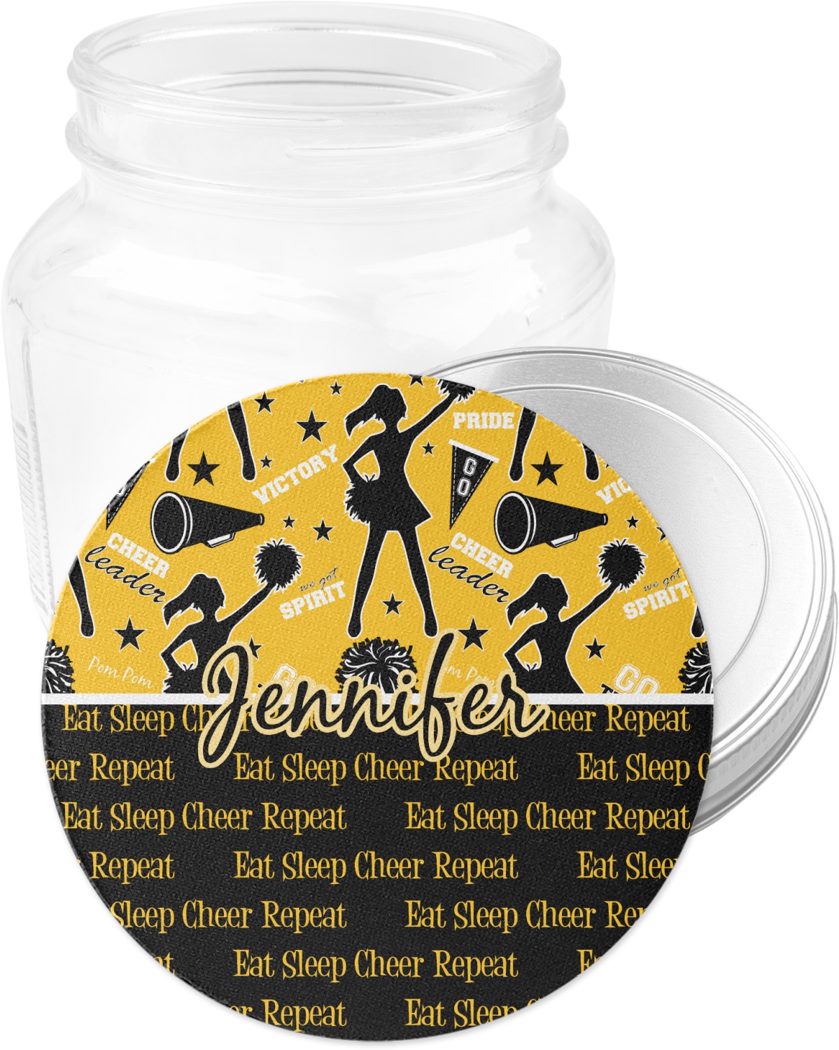 This design is a fun combo with a bright yellow and black. The two colors are a great contrast to one another. The top half of the design has a cheerleader sillhouette as well as words like "cheerleader" and "victory." The bottom half has a background that says eat, sleep, cheer, repeat. Your personalization goes right in between these two backgrounds right in the middle.