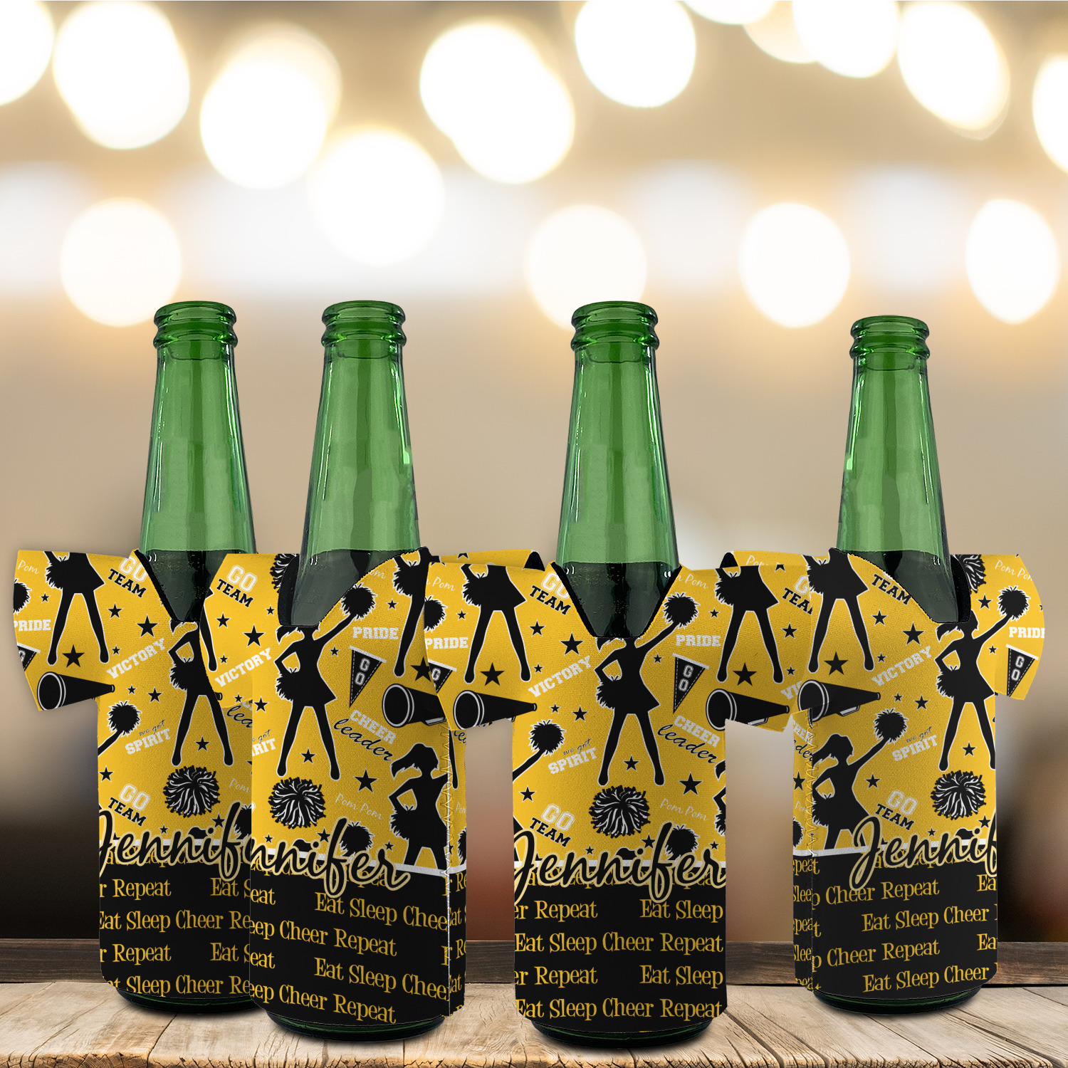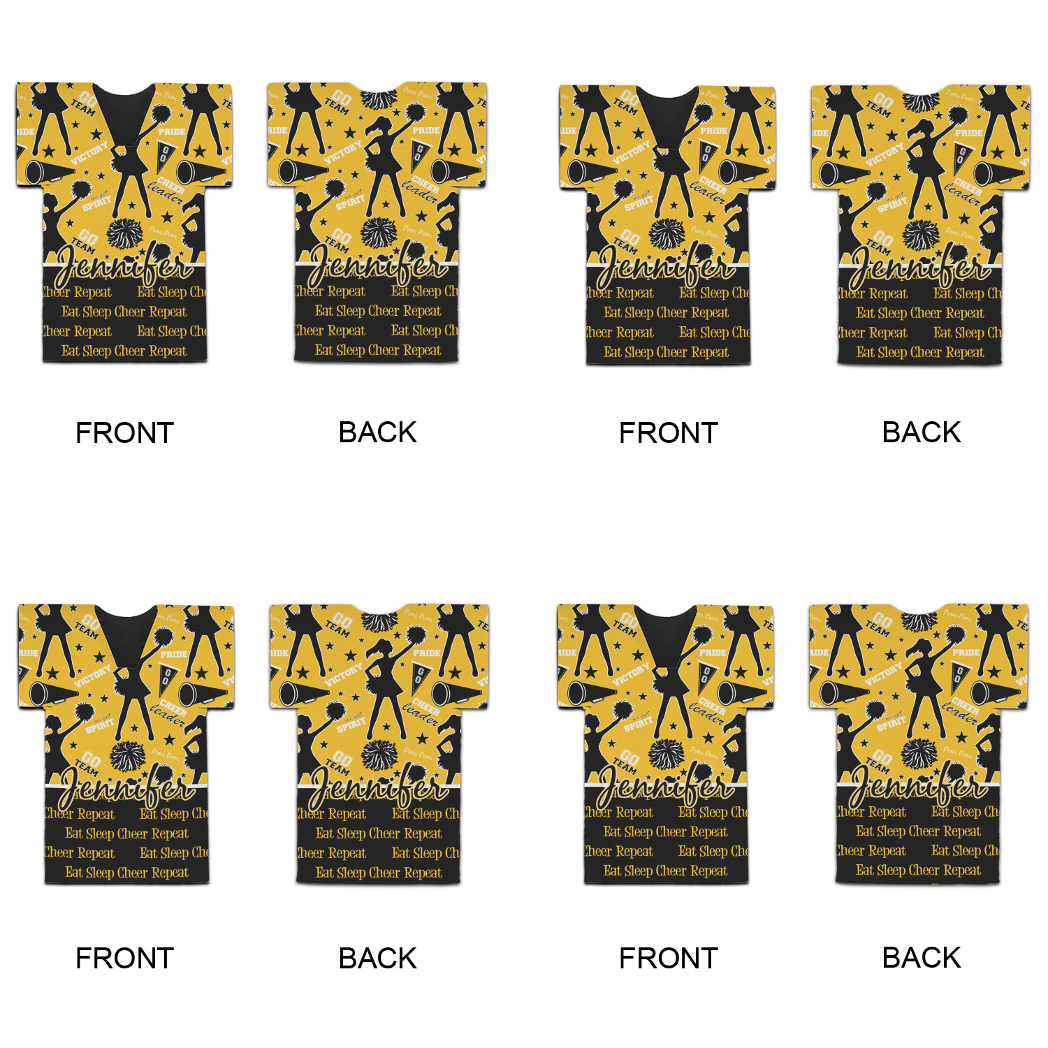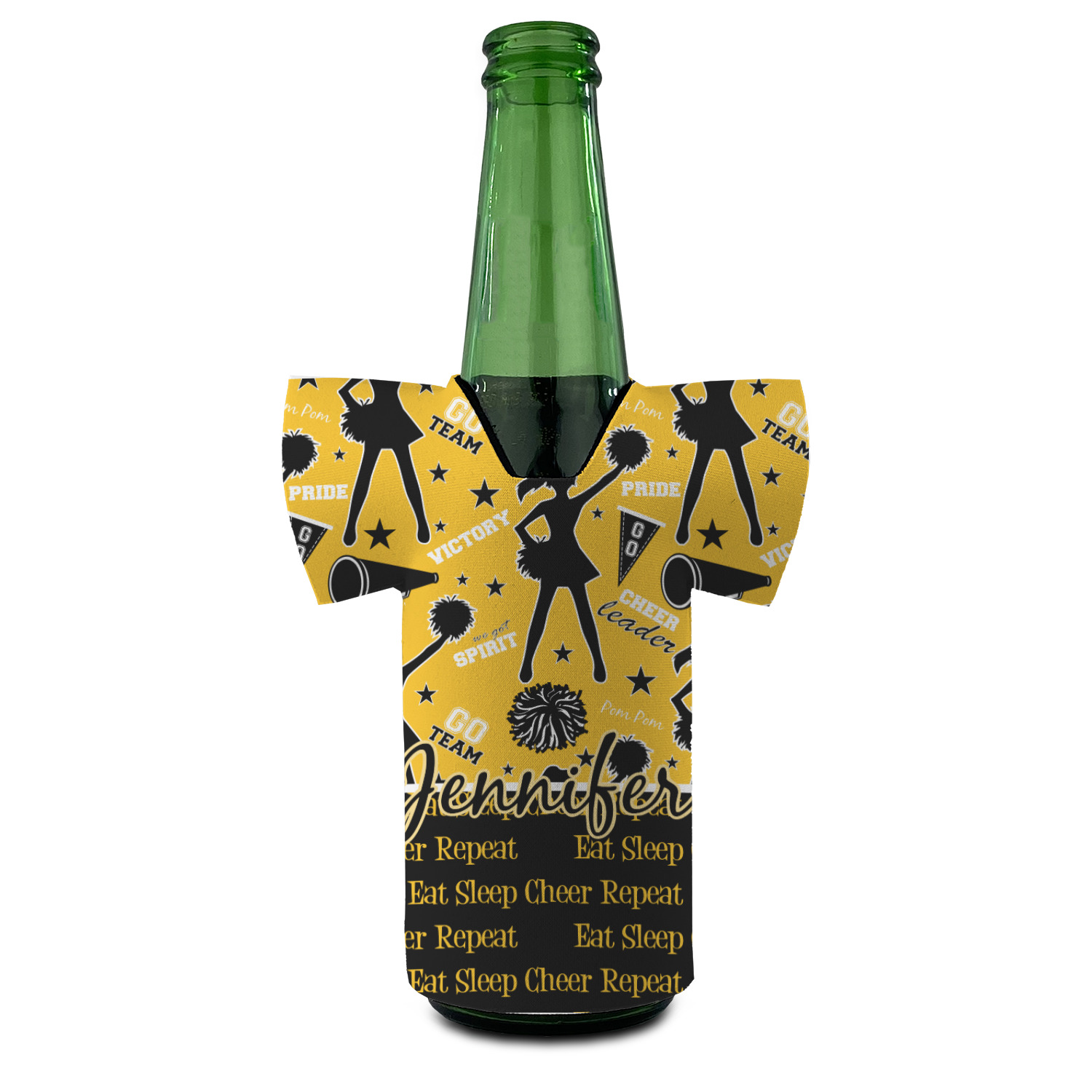 This design is a fun combo with a bright yellow and black. The two colors are a great contrast to one another. The top half of the design has a cheerleader sillhouette as well as words like "cheerleader" and "victory." The bottom half has a background that says eat, sleep, cheer, repeat. Your personalization goes right in between these two backgrounds right in the middle.
