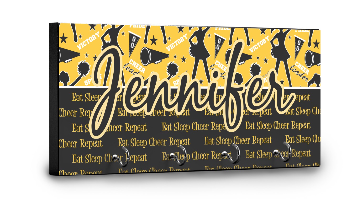 This design is a fun combo with a bright yellow and black. The two colors are a great contrast to one another. The top half of the design has a cheerleader sillhouette as well as words like "cheerleader" and "victory." The bottom half has a background that says eat, sleep, cheer, repeat. Your personalization goes right in between these two backgrounds right in the middle.