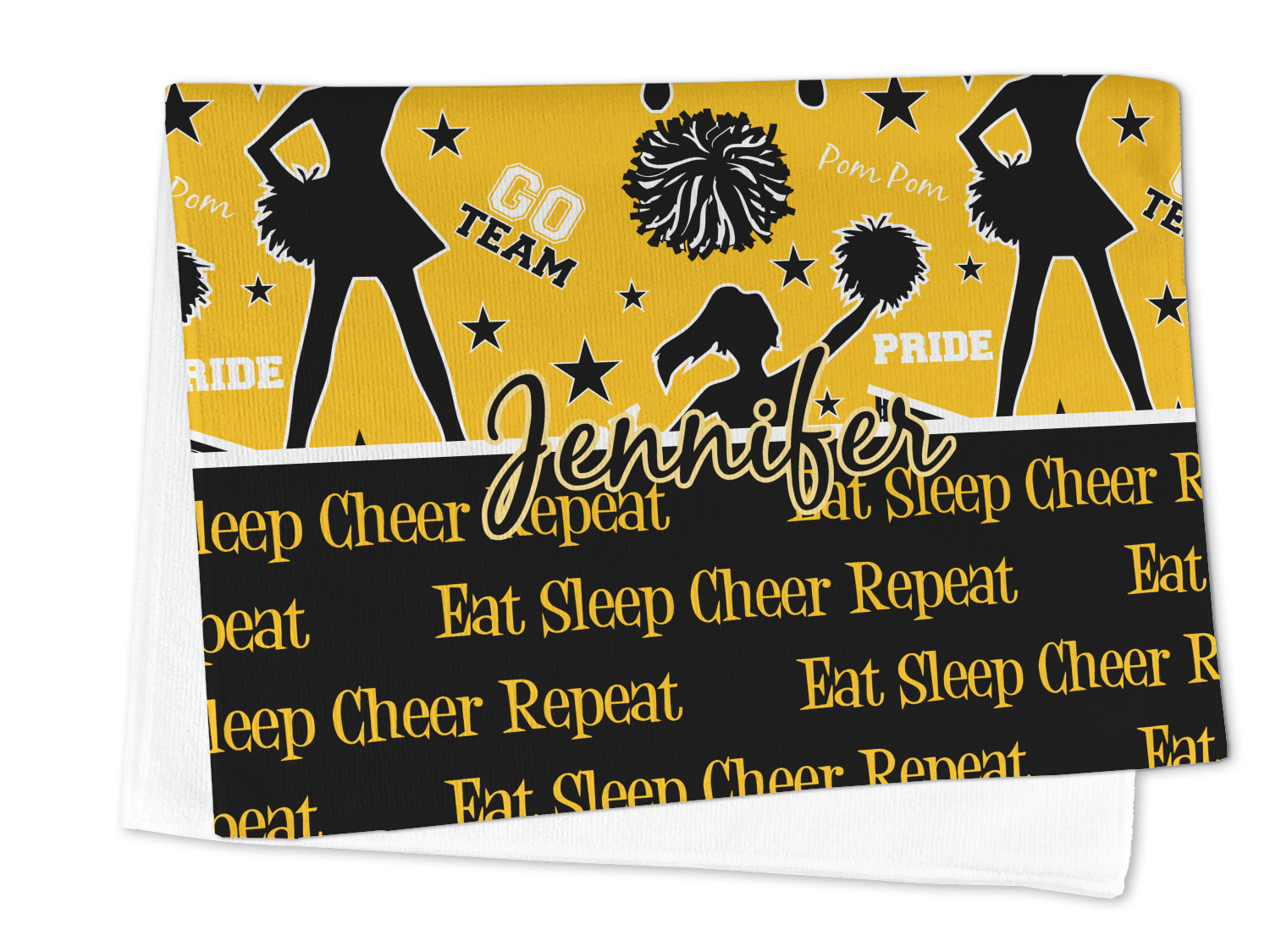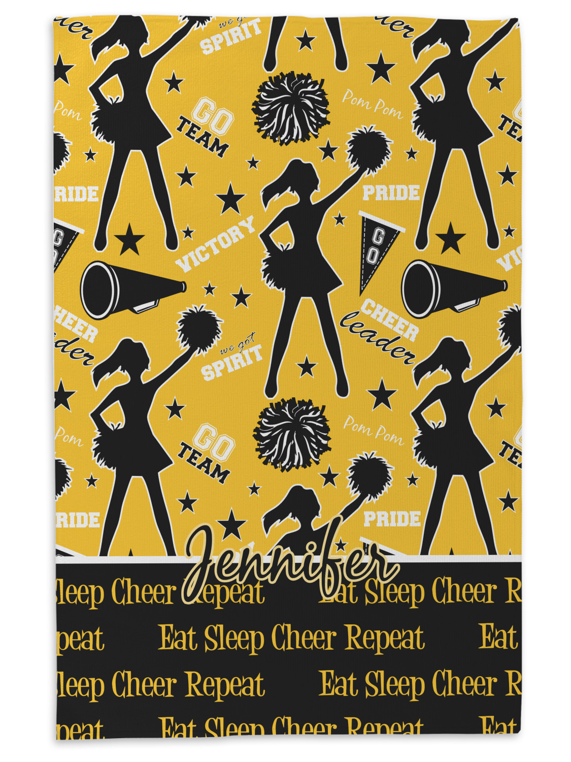 This design is a fun combo with a bright yellow and black. The two colors are a great contrast to one another. The top half of the design has a cheerleader sillhouette as well as words like "cheerleader" and "victory." The bottom half has a background that says eat, sleep, cheer, repeat. Your personalization goes right in between these two backgrounds right in the middle.