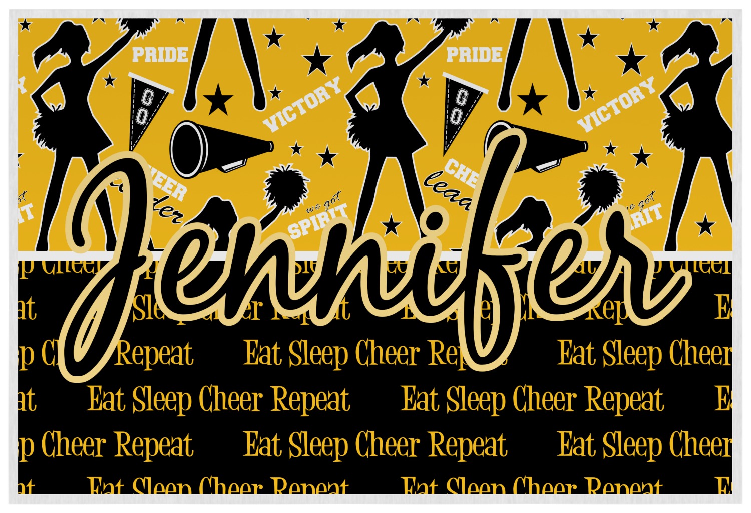 This design is a fun combo with a bright yellow and black. The two colors are a great contrast to one another. The top half of the design has a cheerleader sillhouette as well as words like "cheerleader" and "victory." The bottom half has a background that says eat, sleep, cheer, repeat. Your personalization goes right in between these two backgrounds right in the middle.