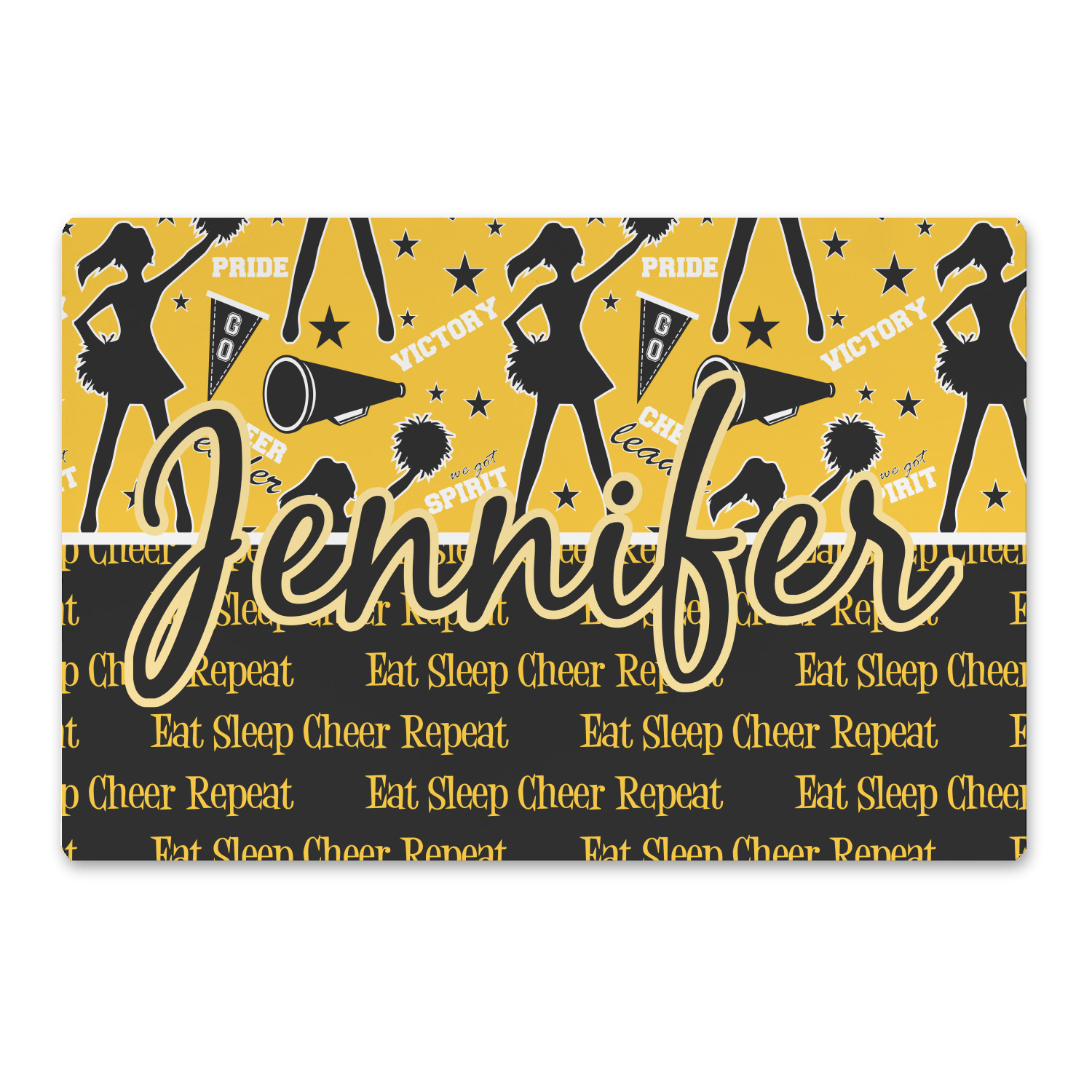This design is a fun combo with a bright yellow and black. The two colors are a great contrast to one another. The top half of the design has a cheerleader sillhouette as well as words like "cheerleader" and "victory." The bottom half has a background that says eat, sleep, cheer, repeat. Your personalization goes right in between these two backgrounds right in the middle.