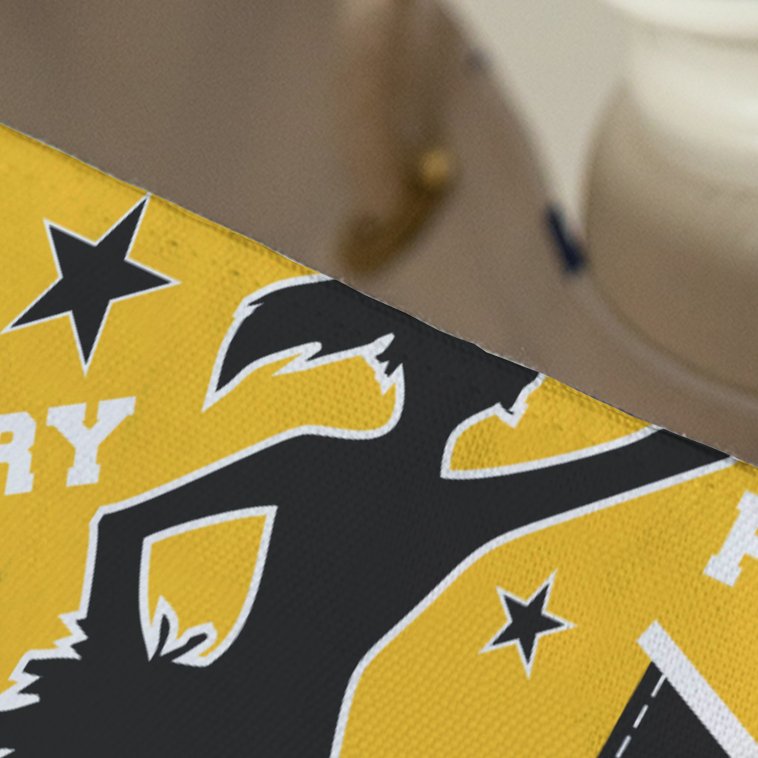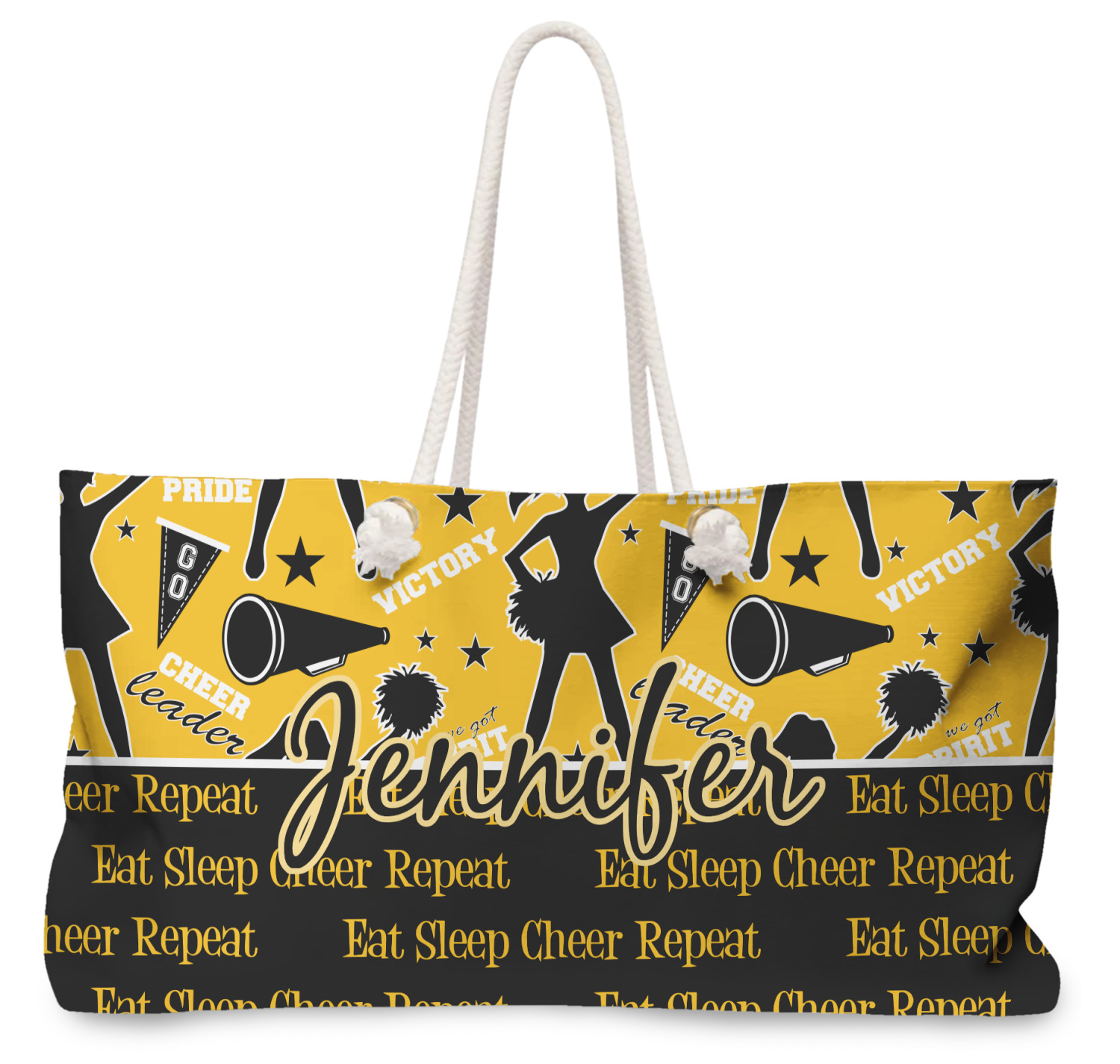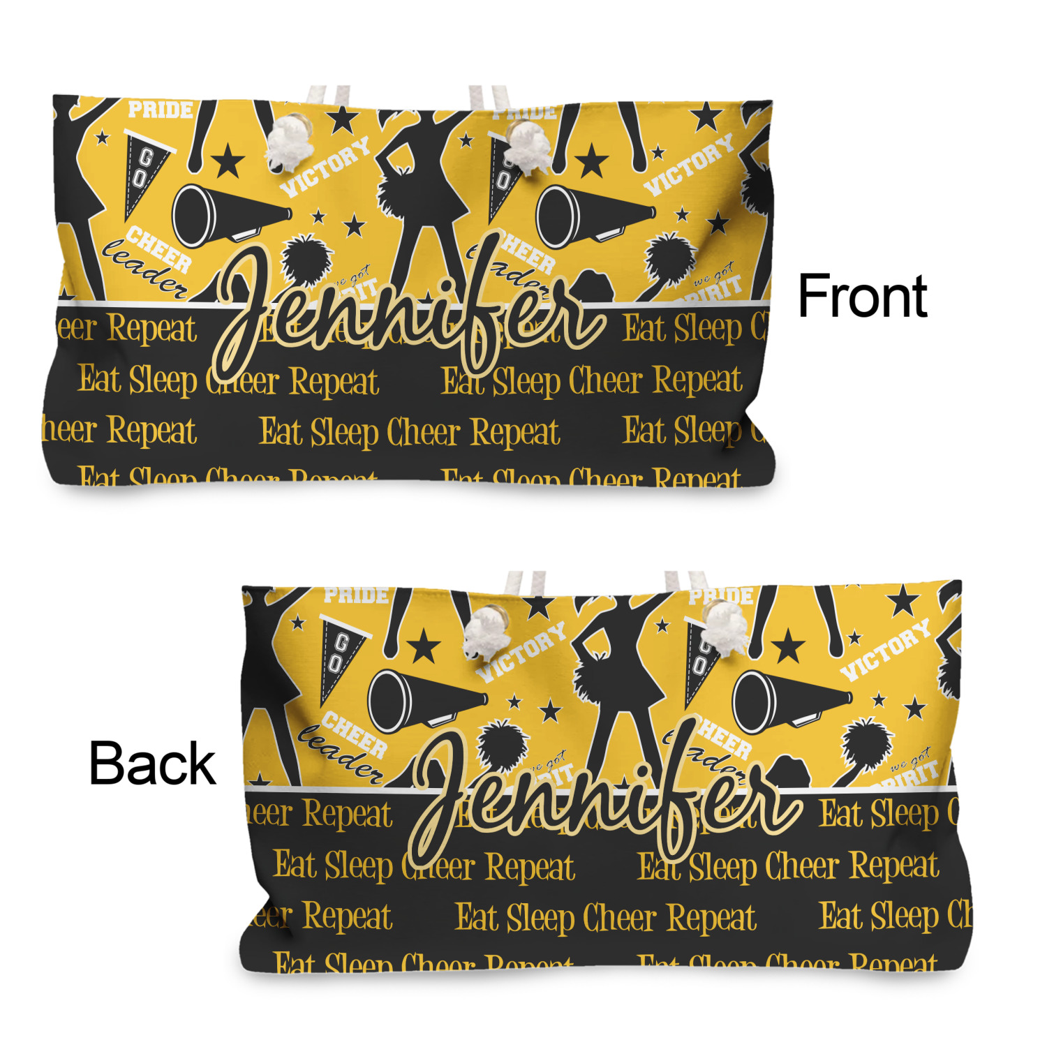 This design is a fun combo with a bright yellow and black. The two colors are a great contrast to one another. The top half of the design has a cheerleader sillhouette as well as words like "cheerleader" and "victory." The bottom half has a background that says eat, sleep, cheer, repeat. Your personalization goes right in between these two backgrounds right in the middle.