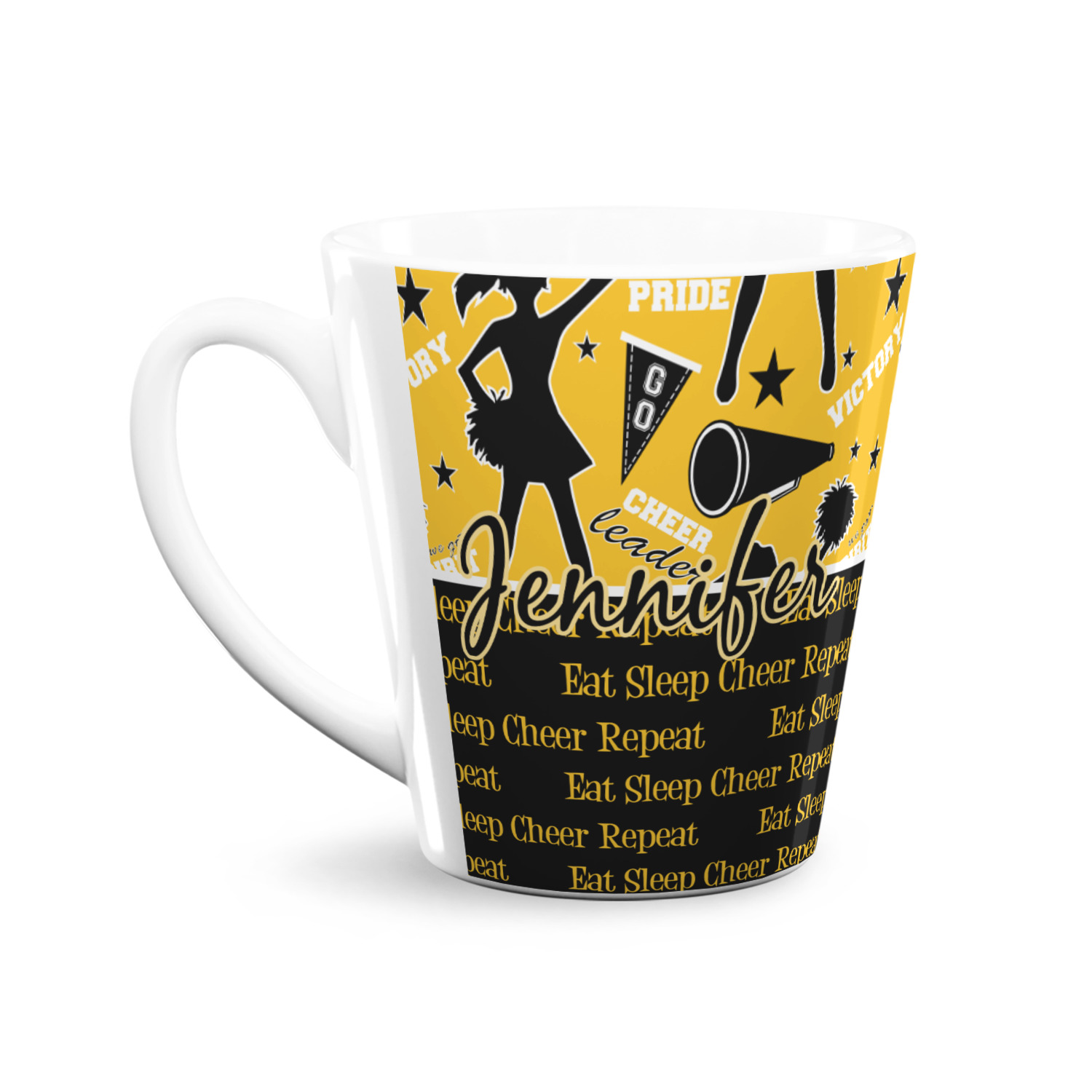 This design is a fun combo with a bright yellow and black. The two colors are a great contrast to one another. The top half of the design has a cheerleader sillhouette as well as words like "cheerleader" and "victory." The bottom half has a background that says eat, sleep, cheer, repeat. Your personalization goes right in between these two backgrounds right in the middle.