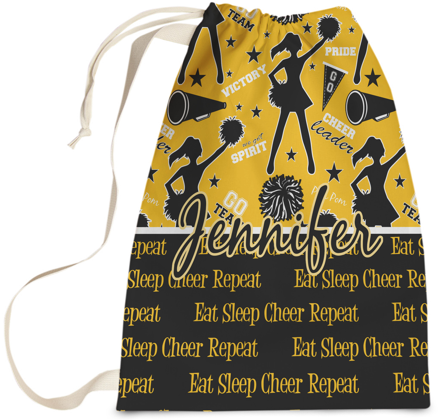 This design is a fun combo with a bright yellow and black. The two colors are a great contrast to one another. The top half of the design has a cheerleader sillhouette as well as words like "cheerleader" and "victory." The bottom half has a background that says eat, sleep, cheer, repeat. Your personalization goes right in between these two backgrounds right in the middle.