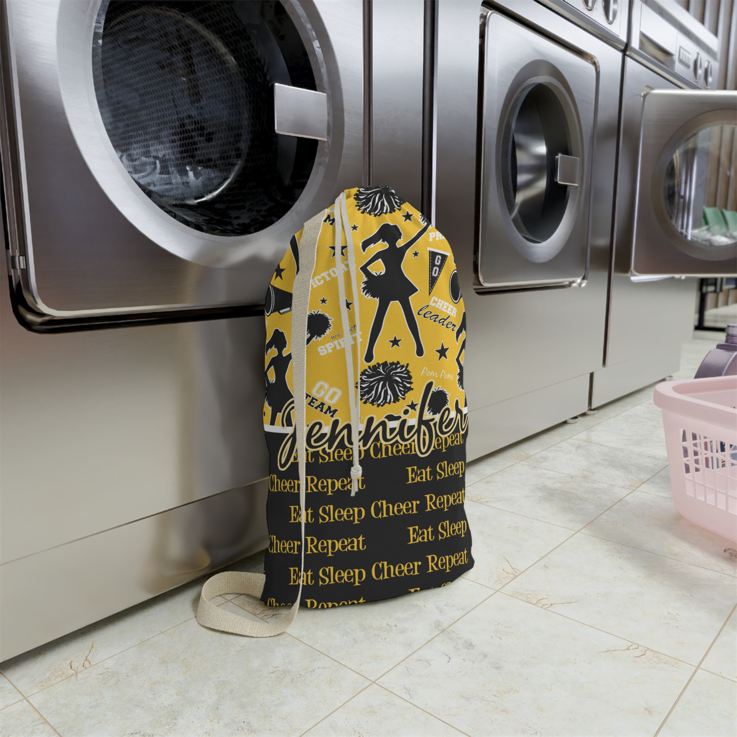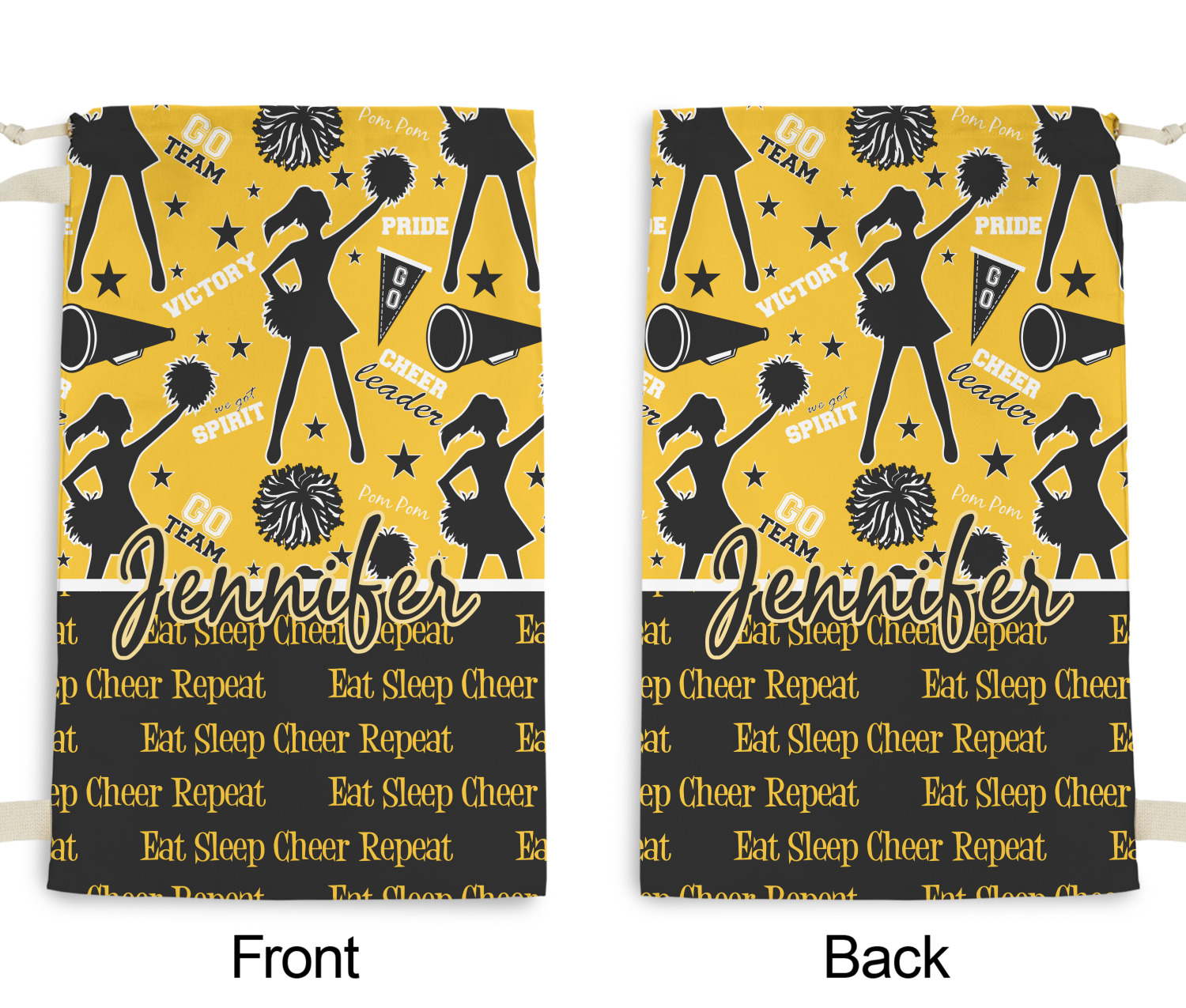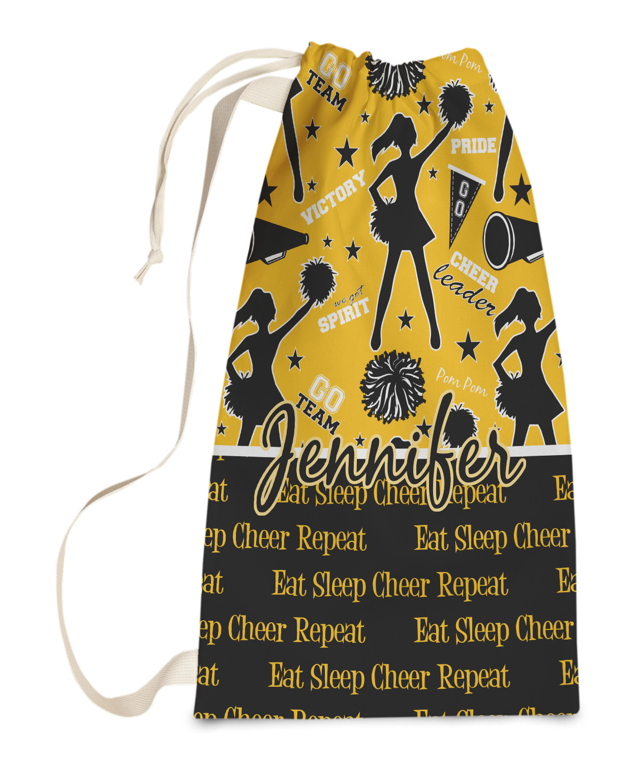 This design is a fun combo with a bright yellow and black. The two colors are a great contrast to one another. The top half of the design has a cheerleader sillhouette as well as words like "cheerleader" and "victory." The bottom half has a background that says eat, sleep, cheer, repeat. Your personalization goes right in between these two backgrounds right in the middle.