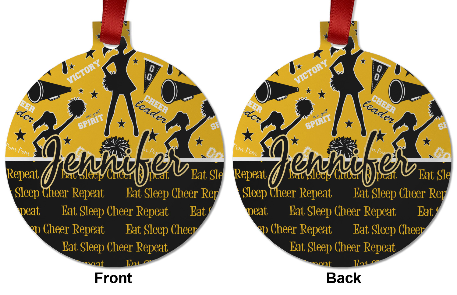 This design is a fun combo with a bright yellow and black. The two colors are a great contrast to one another. The top half of the design has a cheerleader sillhouette as well as words like "cheerleader" and "victory." The bottom half has a background that says eat, sleep, cheer, repeat. Your personalization goes right in between these two backgrounds right in the middle.