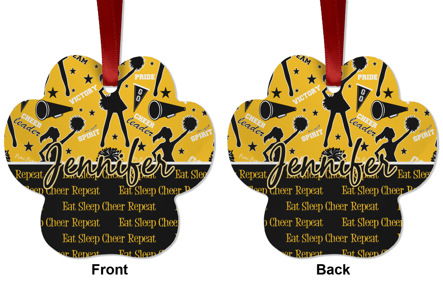 This design is a fun combo with a bright yellow and black. The two colors are a great contrast to one another. The top half of the design has a cheerleader sillhouette as well as words like "cheerleader" and "victory." The bottom half has a background that says eat, sleep, cheer, repeat. Your personalization goes right in between these two backgrounds right in the middle.