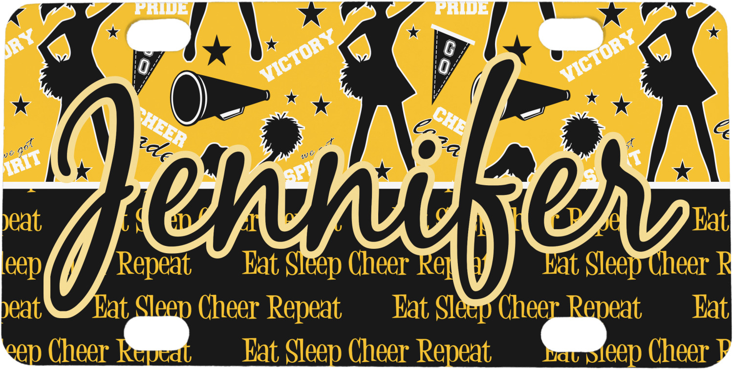 This design is a fun combo with a bright yellow and black. The two colors are a great contrast to one another. The top half of the design has a cheerleader sillhouette as well as words like "cheerleader" and "victory." The bottom half has a background that says eat, sleep, cheer, repeat. Your personalization goes right in between these two backgrounds right in the middle.