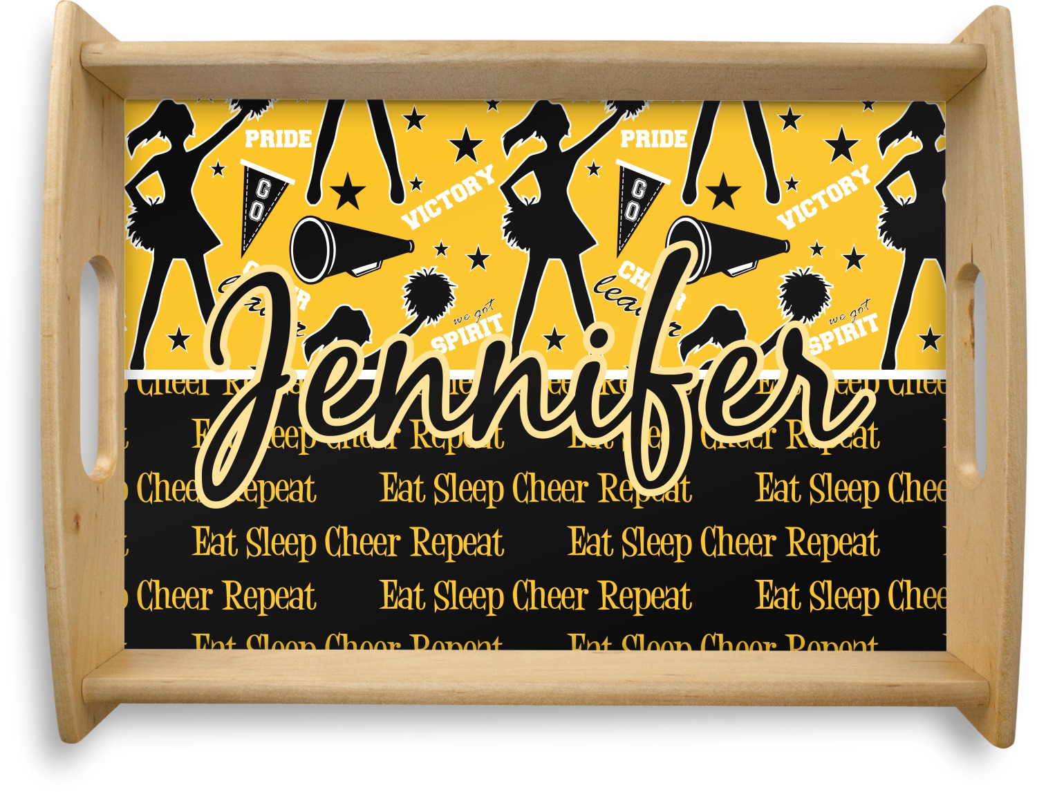 This design is a fun combo with a bright yellow and black. The two colors are a great contrast to one another. The top half of the design has a cheerleader sillhouette as well as words like "cheerleader" and "victory." The bottom half has a background that says eat, sleep, cheer, repeat. Your personalization goes right in between these two backgrounds right in the middle.