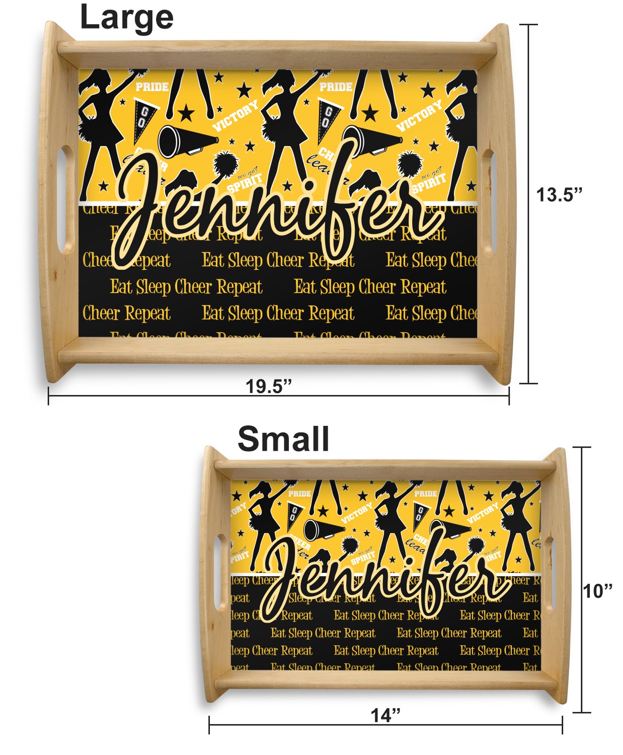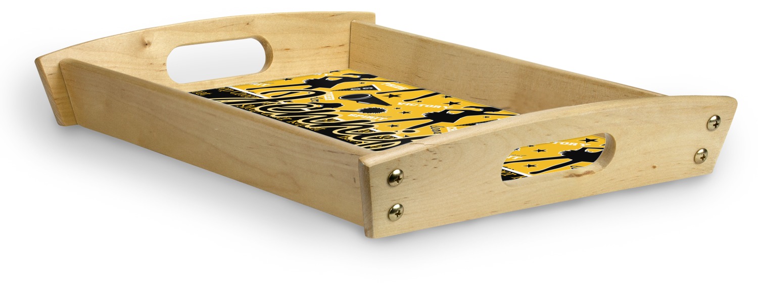 This serving tray with handles features square edges and two rounded sides, creating a very modern look. Each side is fabricated from a beautifully cut, natural wood. The bottom of the interior of the tray displays your customized design in bright, vibrant color. The tray is sold in both a black color and a natural wood look. Each variation of the wood serving tray has two sizes: Small, which is 14" x 10" x 2.25", and Large, which is 19.5" x 13.5" x 2.75".