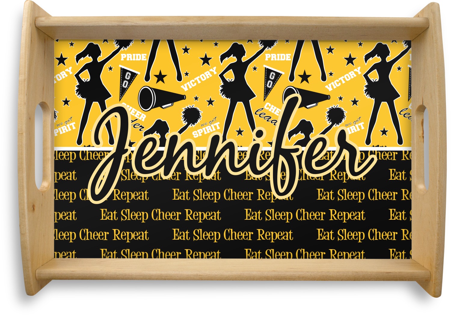 This design is a fun combo with a bright yellow and black. The two colors are a great contrast to one another. The top half of the design has a cheerleader sillhouette as well as words like "cheerleader" and "victory." The bottom half has a background that says eat, sleep, cheer, repeat. Your personalization goes right in between these two backgrounds right in the middle.