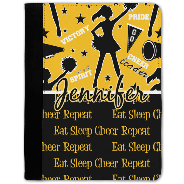 These personalized padfolios are made from a black, polyester microfiber and features a standard, 50-page notepad. However, these black padfolios can accommodate a pad with up to 100 pages. This model also features a slot pocket for any loose sheets of paper, small pockets for business cards, and an elastic band to secure a pen. We print your personalization across the front of this notepad portfolio in bright, vibrant color. These padfolios come in 2 sizes, Medium - approximately 10.25" x 8" for 5" x 8" paper and Large - approximately 12.5" x 8.5" for 8.5" x 11" paper.