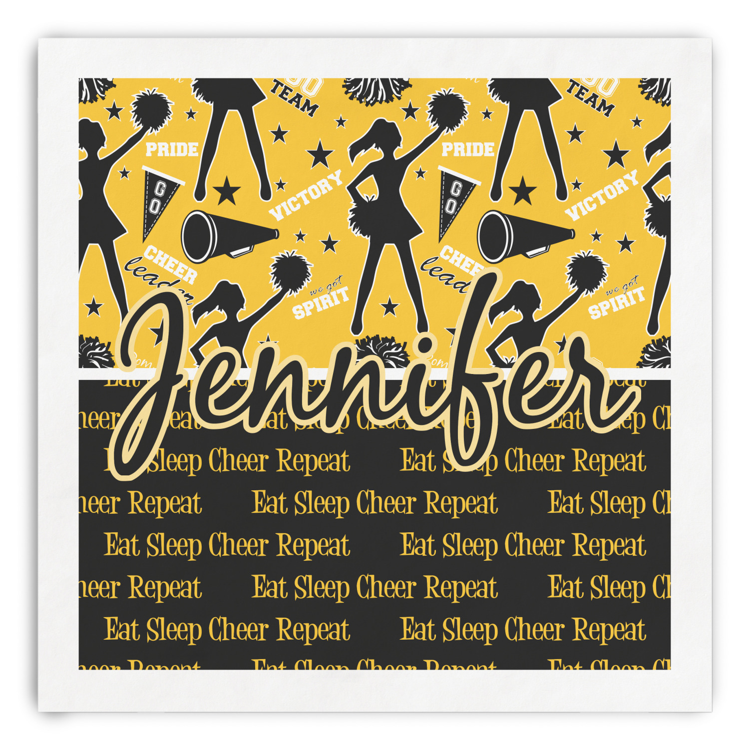 This design is a fun combo with a bright yellow and black. The two colors are a great contrast to one another. The top half of the design has a cheerleader sillhouette as well as words like "cheerleader" and "victory." The bottom half has a background that says eat, sleep, cheer, repeat. Your personalization goes right in between these two backgrounds right in the middle.