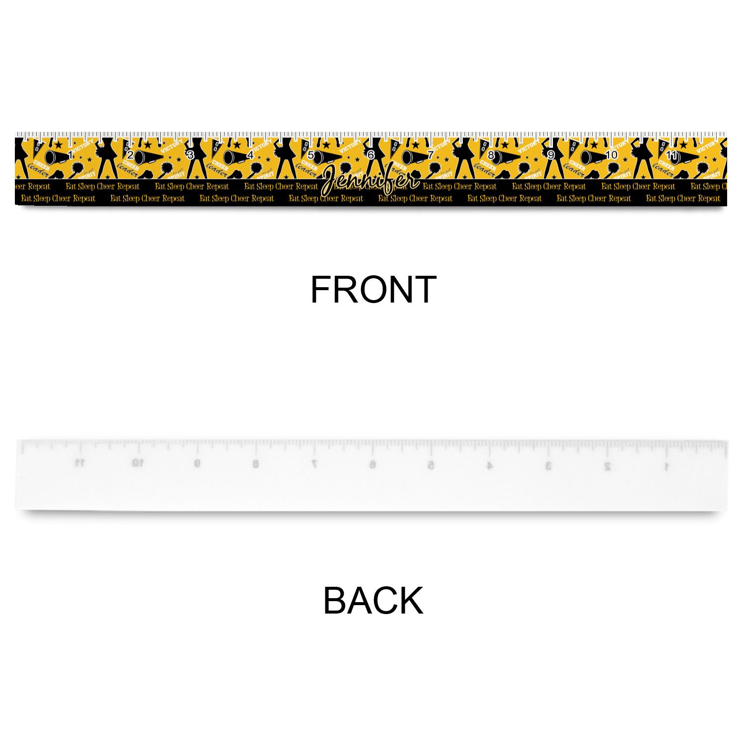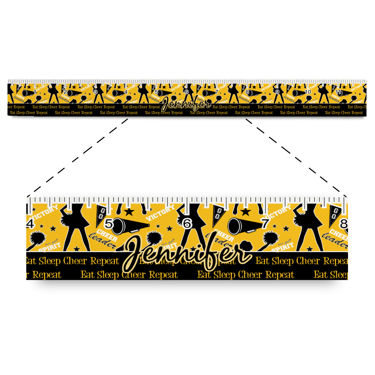 This design is a fun combo with a bright yellow and black. The two colors are a great contrast to one another. The top half of the design has a cheerleader sillhouette as well as words like "cheerleader" and "victory." The bottom half has a background that says eat, sleep, cheer, repeat. Your personalization goes right in between these two backgrounds right in the middle.