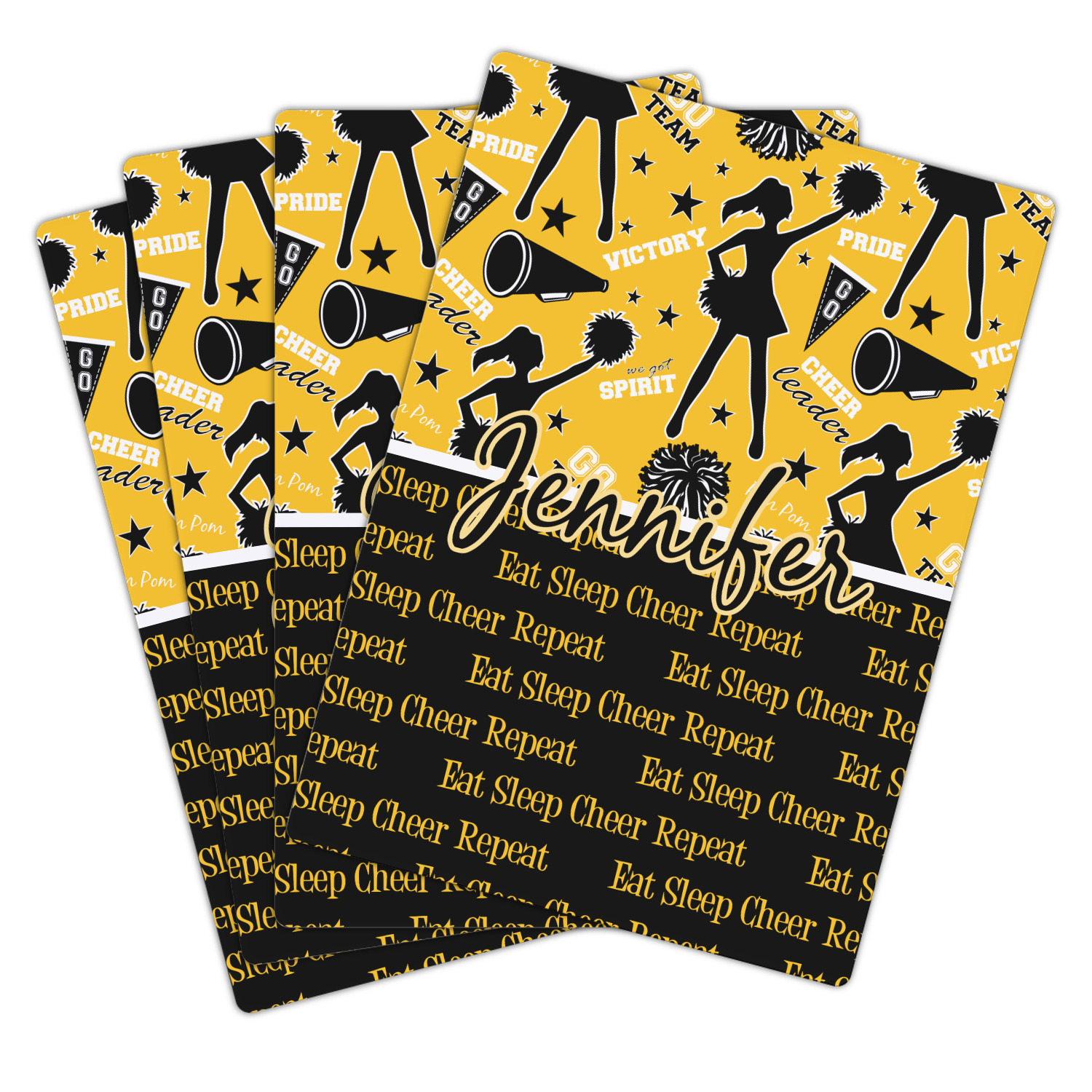 This design is a fun combo with a bright yellow and black. The two colors are a great contrast to one another. The top half of the design has a cheerleader sillhouette as well as words like "cheerleader" and "victory." The bottom half has a background that says eat, sleep, cheer, repeat. Your personalization goes right in between these two backgrounds right in the middle.