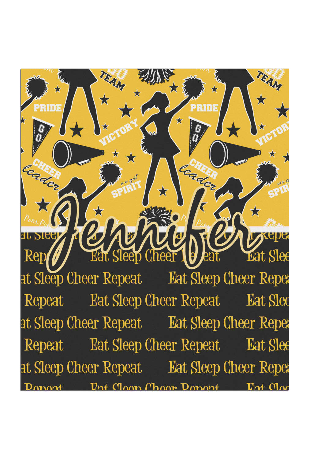 This design is a fun combo with a bright yellow and black. The two colors are a great contrast to one another. The top half of the design has a cheerleader sillhouette as well as words like "cheerleader" and "victory." The bottom half has a background that says eat, sleep, cheer, repeat. Your personalization goes right in between these two backgrounds right in the middle.