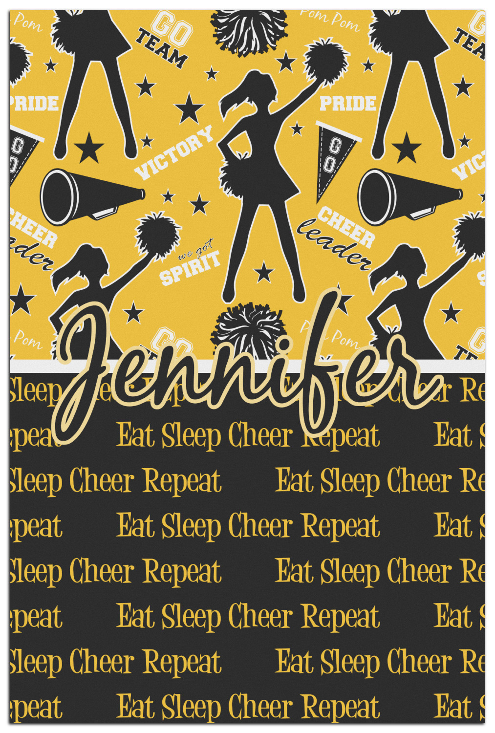 This design is a fun combo with a bright yellow and black. The two colors are a great contrast to one another. The top half of the design has a cheerleader sillhouette as well as words like "cheerleader" and "victory." The bottom half has a background that says eat, sleep, cheer, repeat. Your personalization goes right in between these two backgrounds right in the middle.