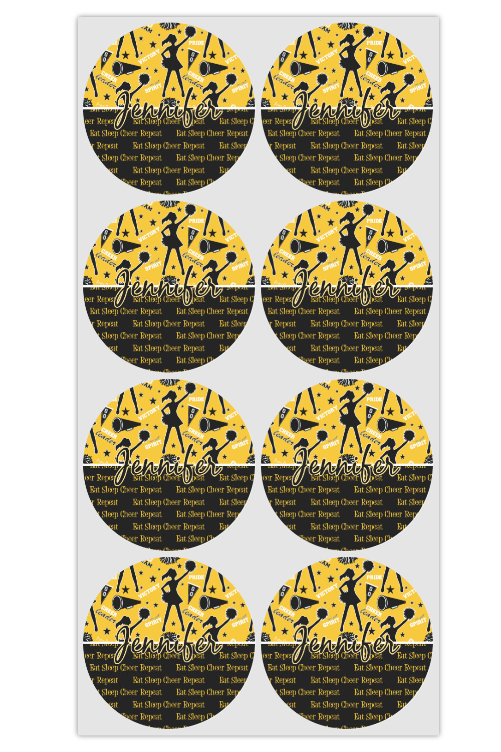 This design is a fun combo with a bright yellow and black. The two colors are a great contrast to one another. The top half of the design has a cheerleader sillhouette as well as words like "cheerleader" and "victory." The bottom half has a background that says eat, sleep, cheer, repeat. Your personalization goes right in between these two backgrounds right in the middle.