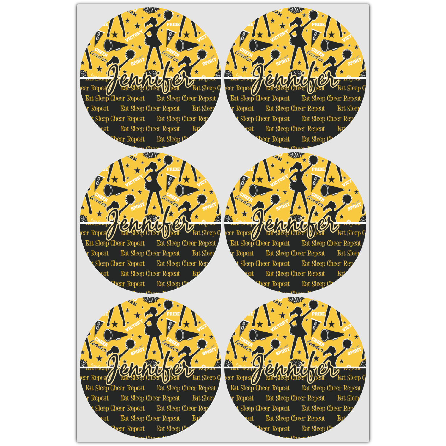 This design is a fun combo with a bright yellow and black. The two colors are a great contrast to one another. The top half of the design has a cheerleader sillhouette as well as words like "cheerleader" and "victory." The bottom half has a background that says eat, sleep, cheer, repeat. Your personalization goes right in between these two backgrounds right in the middle.