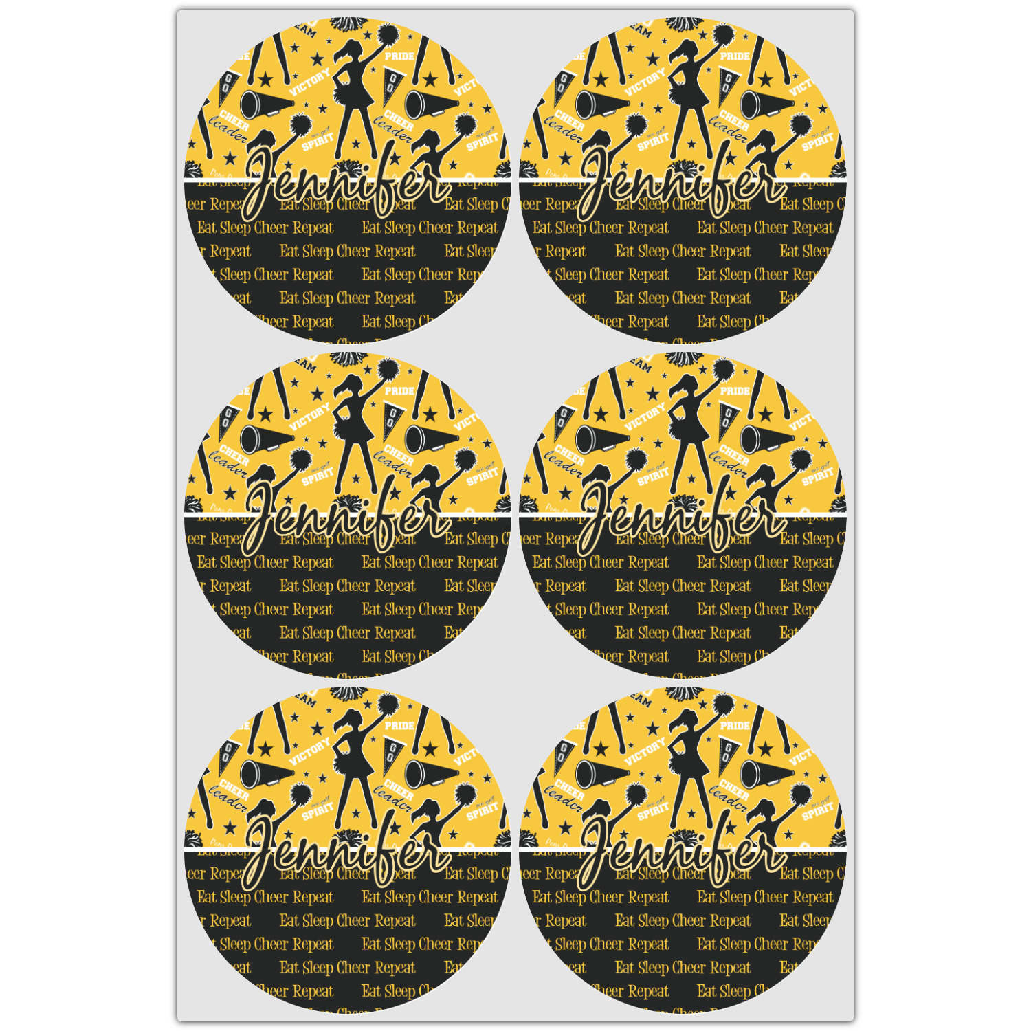 This design is a fun combo with a bright yellow and black. The two colors are a great contrast to one another. The top half of the design has a cheerleader sillhouette as well as words like "cheerleader" and "victory." The bottom half has a background that says eat, sleep, cheer, repeat. Your personalization goes right in between these two backgrounds right in the middle.