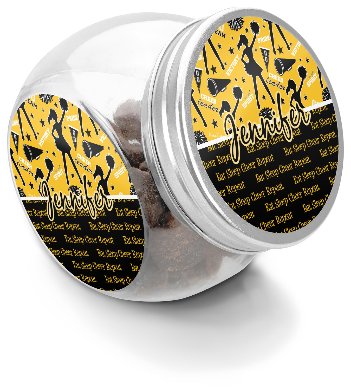 This treat jar is an excellent way to store treats for your favorite canine or feline. Moreover, their delicate, classy appearance makes them a tasteful addition to your countertop's décor. Crafted from clear glass, its unique construction and silver metal, screw-on lid allows for quick and easy access. Three, permanent, vinyl stickers are applied to both sides of the jar and lid, presenting your personalized design. The base of this glass, dog treat jar is 3.4" x 4.75", and the jar stands at 5" tall. Though on the smaller side, this jar is best suited for smaller treats or training treats.