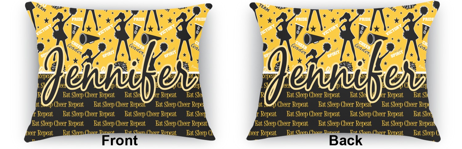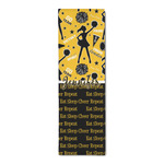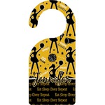 This design is a fun combo with a bright yellow and black. The two colors are a great contrast to one another. The top half of the design has a cheerleader sillhouette as well as words like "cheerleader" and "victory." The bottom half has a background that says eat, sleep, cheer, repeat. Your personalization goes right in between these two backgrounds right in the middle.