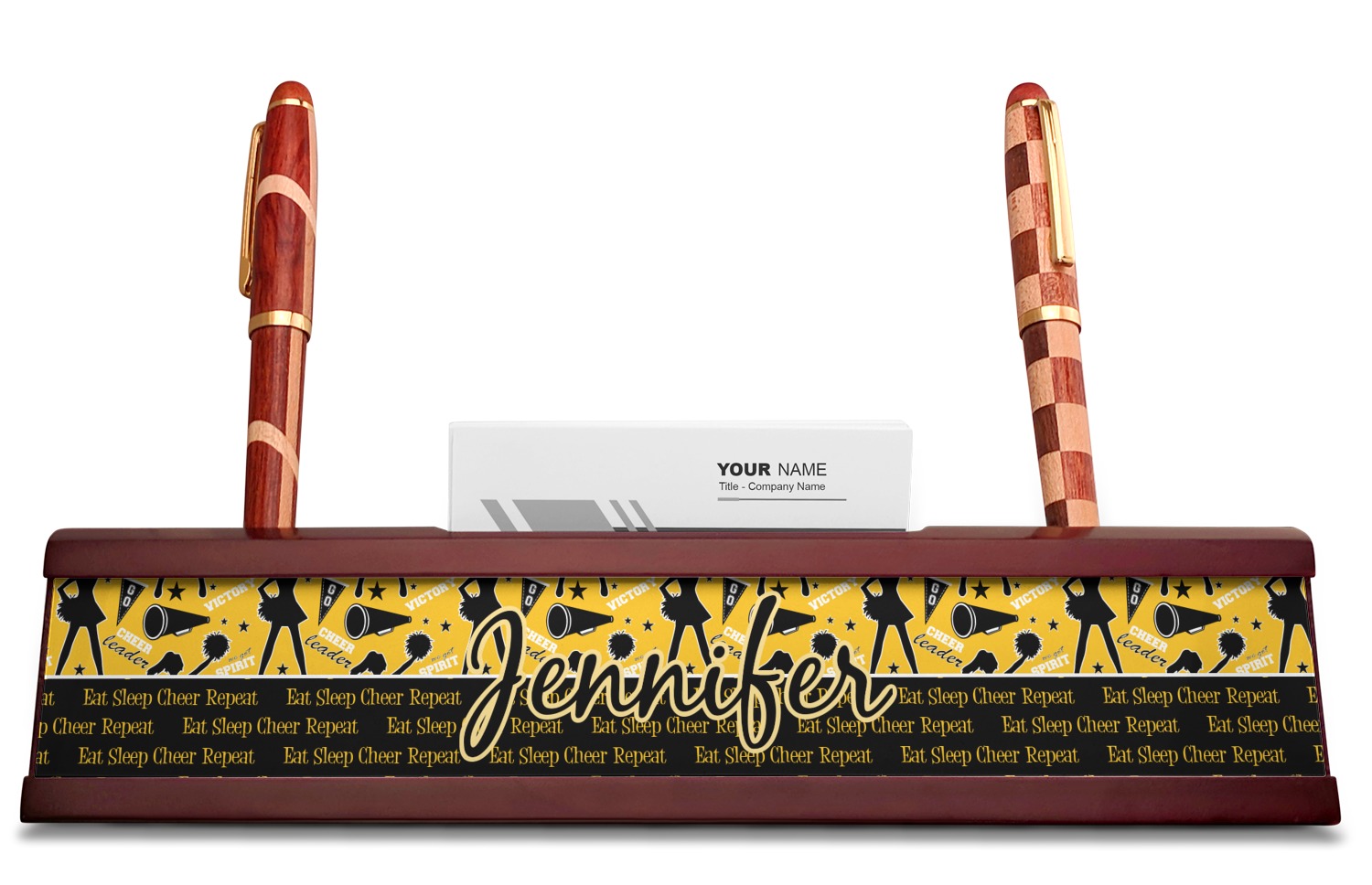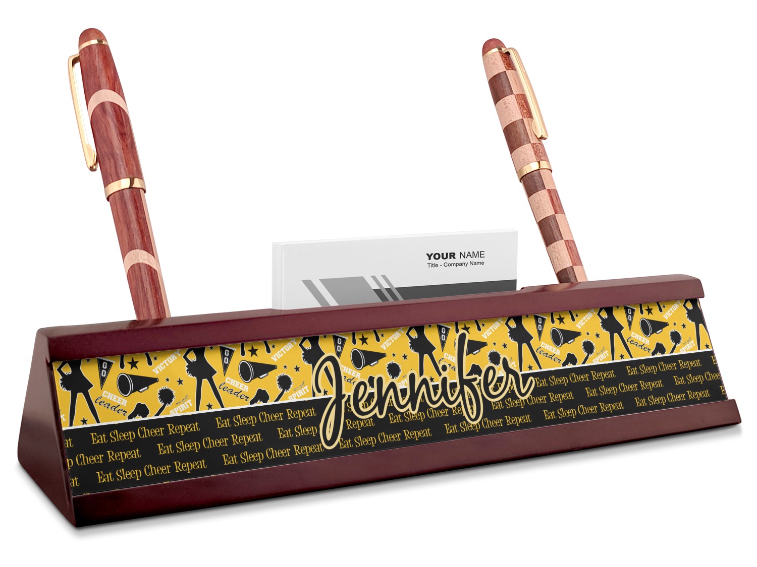 Your desk name plates are crafted from a high-quality, dark-cherry mahogany. At approximately 9.5 by 1.875 by 2.5 inches, this name plaque will fit perfectly, front and center, on your desk. Your customization spans across the entire face of the nameplate. Behind the nameplate lies a skinny slot that can fit approximately 15, traditionally-sized, business cards. You can also store your writing utensils on either side of this custom desk name plate.