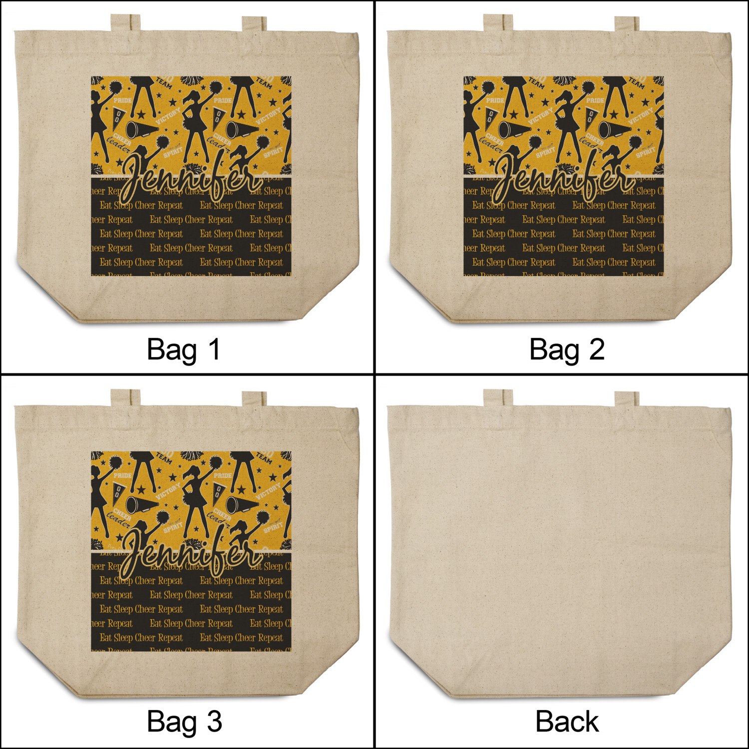 This design is a fun combo with a bright yellow and black. The two colors are a great contrast to one another. The top half of the design has a cheerleader sillhouette as well as words like "cheerleader" and "victory." The bottom half has a background that says eat, sleep, cheer, repeat. Your personalization goes right in between these two backgrounds right in the middle.