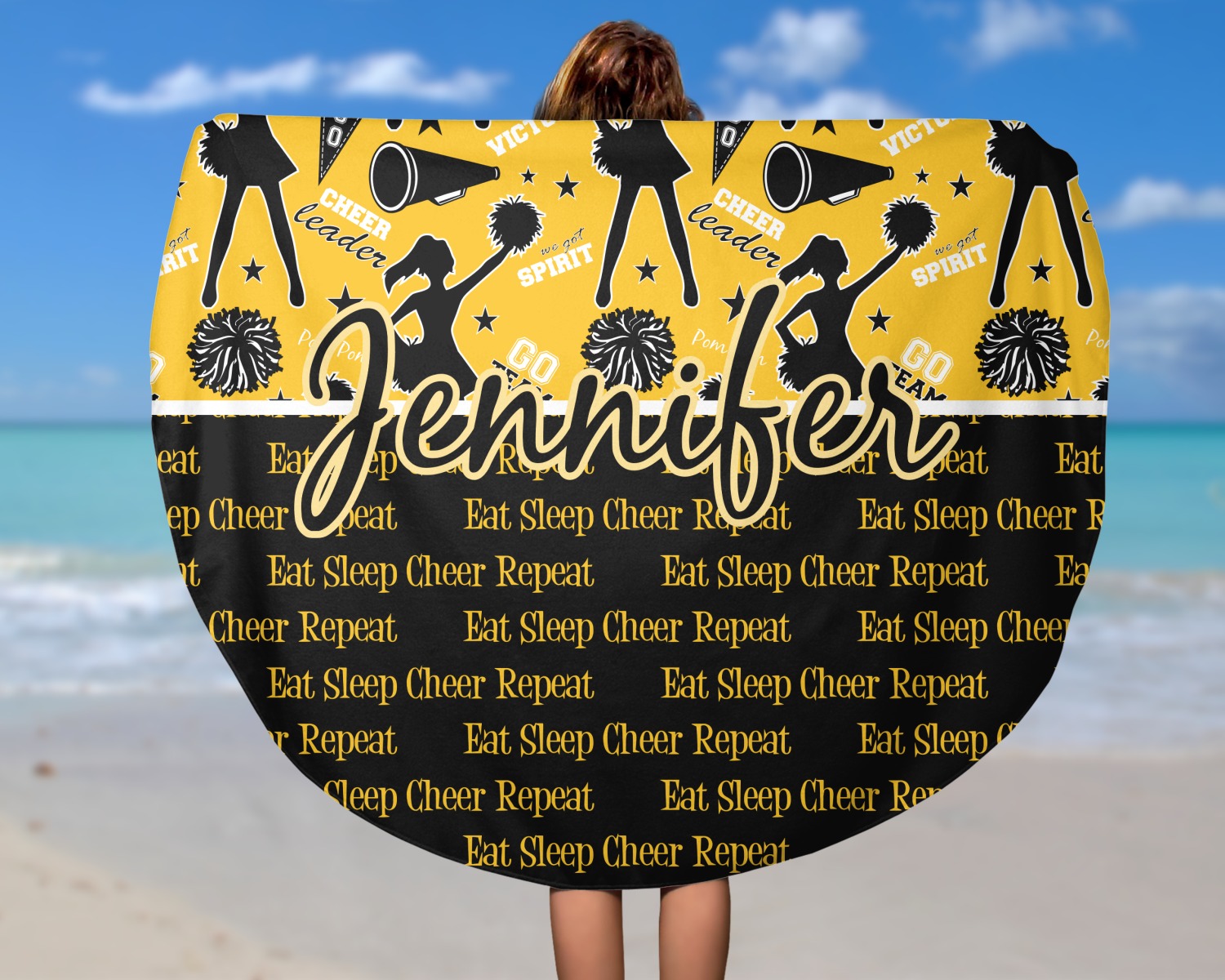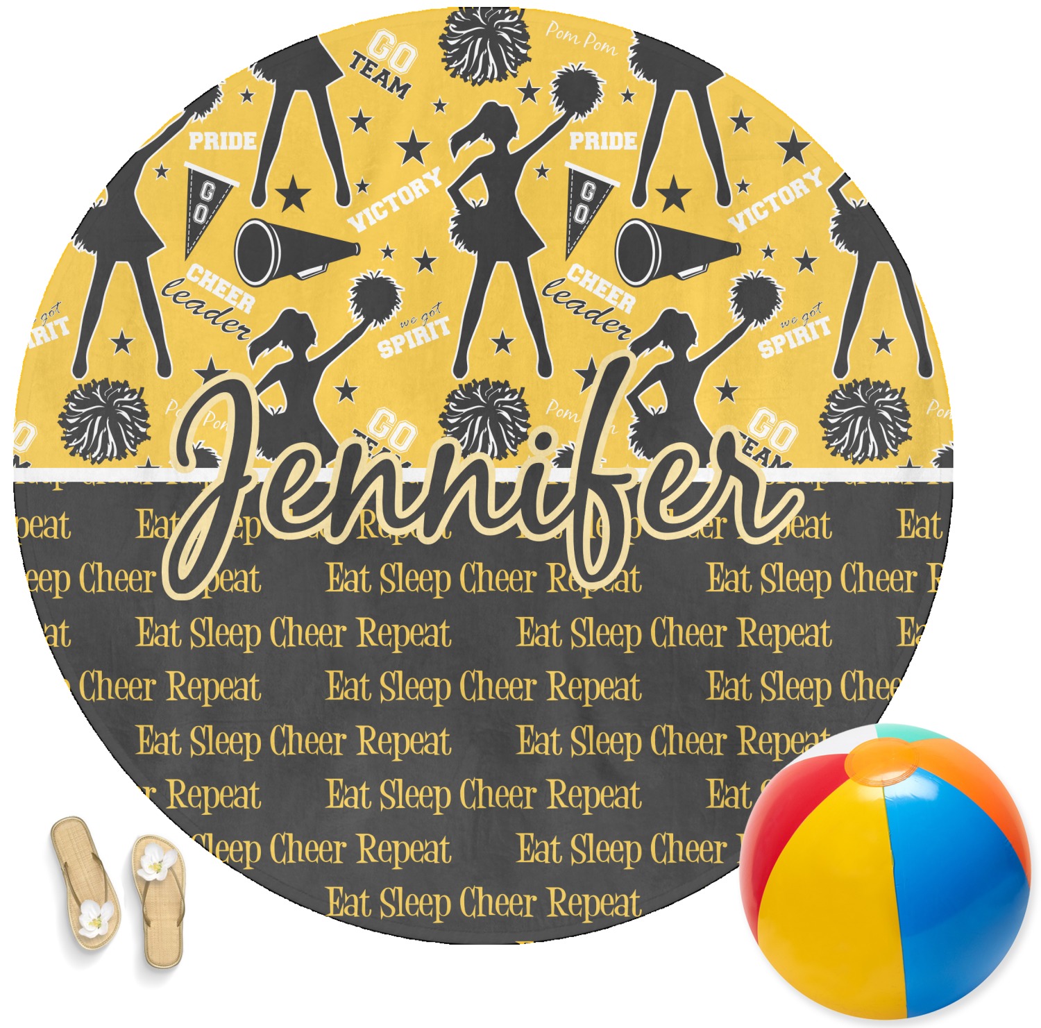 This design is a fun combo with a bright yellow and black. The two colors are a great contrast to one another. The top half of the design has a cheerleader sillhouette as well as words like "cheerleader" and "victory." The bottom half has a background that says eat, sleep, cheer, repeat. Your personalization goes right in between these two backgrounds right in the middle.