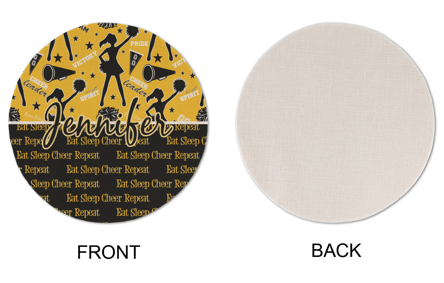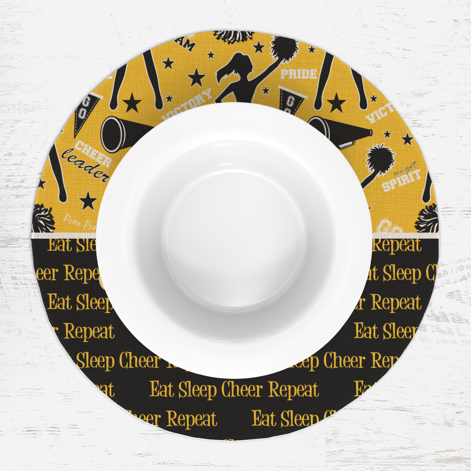 This design is a fun combo with a bright yellow and black. The two colors are a great contrast to one another. The top half of the design has a cheerleader sillhouette as well as words like "cheerleader" and "victory." The bottom half has a background that says eat, sleep, cheer, repeat. Your personalization goes right in between these two backgrounds right in the middle.