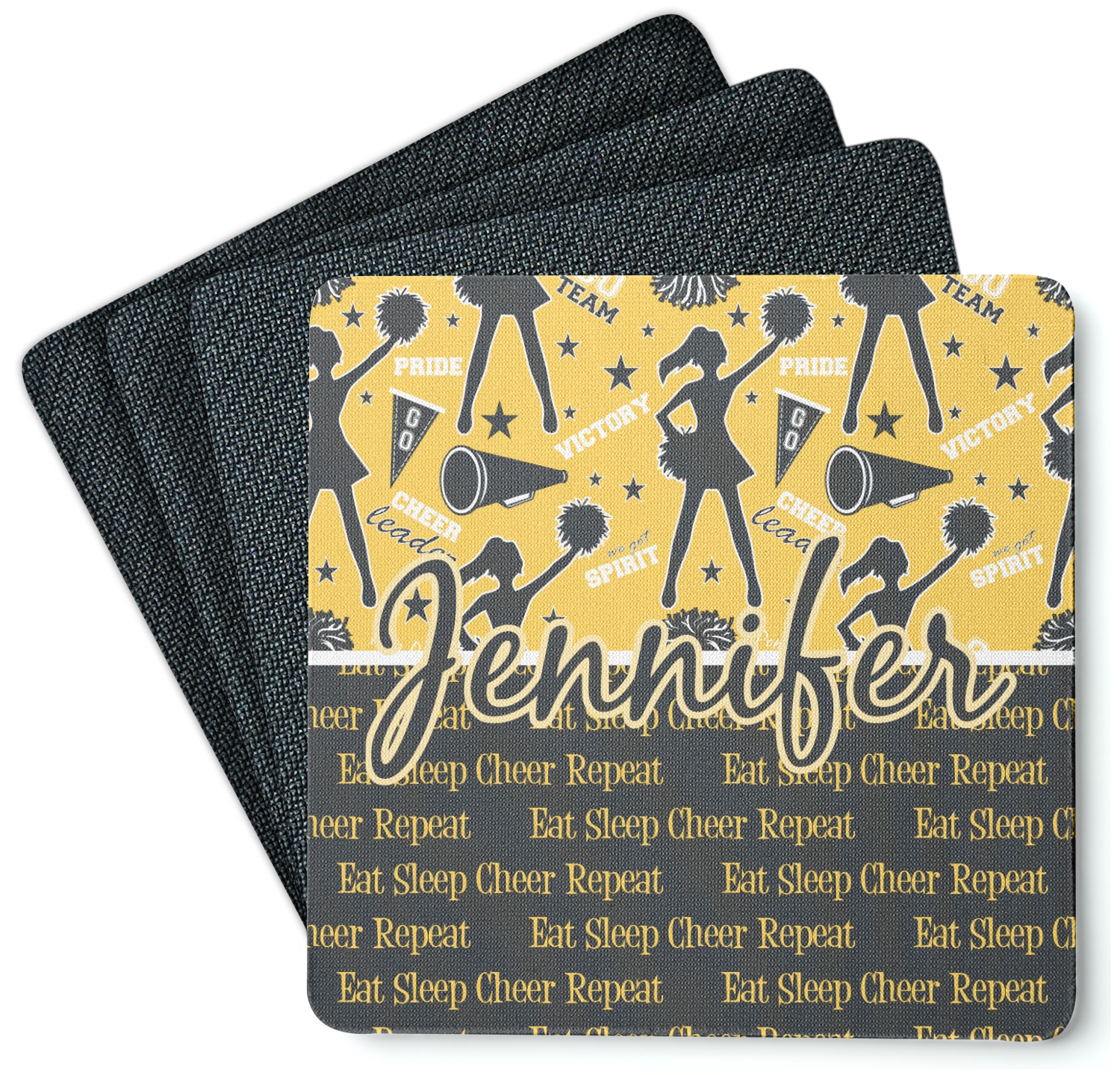 This design is a fun combo with a bright yellow and black. The two colors are a great contrast to one another. The top half of the design has a cheerleader sillhouette as well as words like "cheerleader" and "victory." The bottom half has a background that says eat, sleep, cheer, repeat. Your personalization goes right in between these two backgrounds right in the middle.