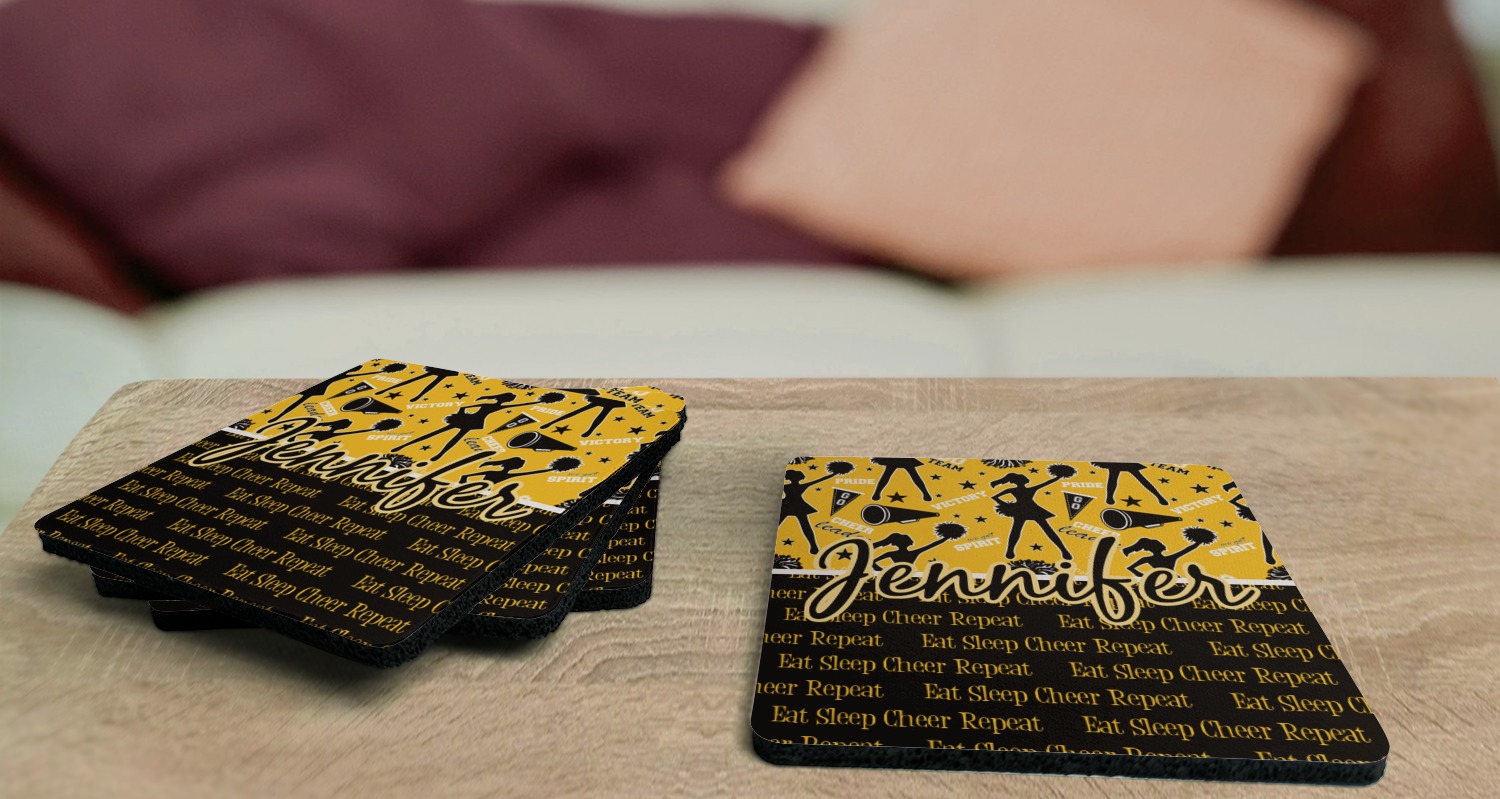 These drink coasters have a smooth, polyester top and a textured, rubber backing on its bottom. The non-slip rubber backing underneath works to keep any spills at bay. At 4 by 4 by 0.25 inches thick, these custom coasters are a suitable size for most drinkware. Your personalization is displayed atop the face of the cup coaster. We sell these rubber coasters in two different shapes: square and round. You can buy each shape as singulars or as a set of 4.