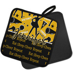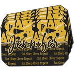 This design is a fun combo with a bright yellow and black. The two colors are a great contrast to one another. The top half of the design has a cheerleader sillhouette as well as words like "cheerleader" and "victory." The bottom half has a background that says eat, sleep, cheer, repeat. Your personalization goes right in between these two backgrounds right in the middle.