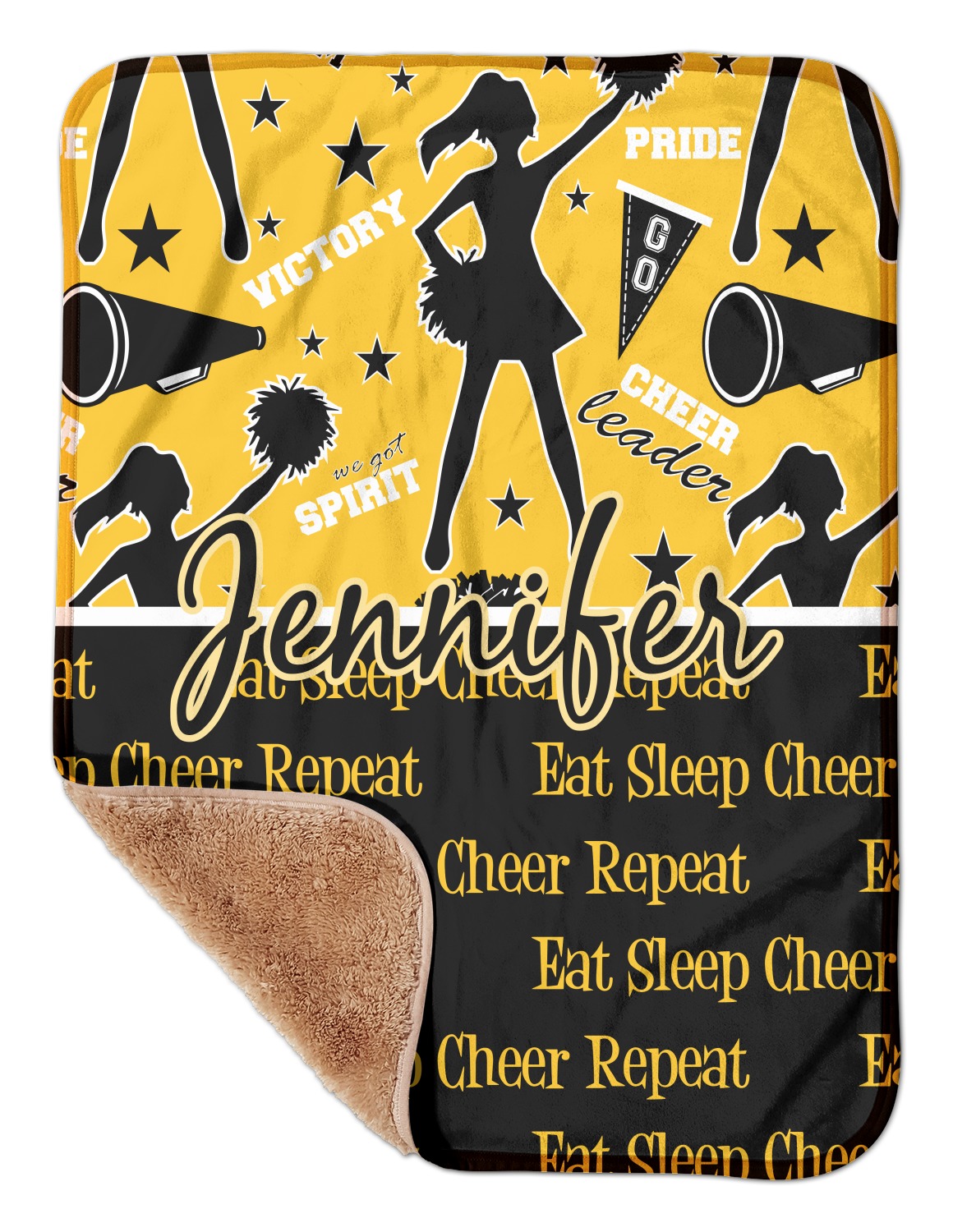 This design is a fun combo with a bright yellow and black. The two colors are a great contrast to one another. The top half of the design has a cheerleader sillhouette as well as words like "cheerleader" and "victory." The bottom half has a background that says eat, sleep, cheer, repeat. Your personalization goes right in between these two backgrounds right in the middle.