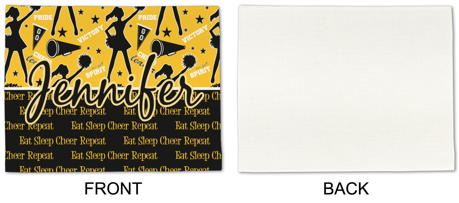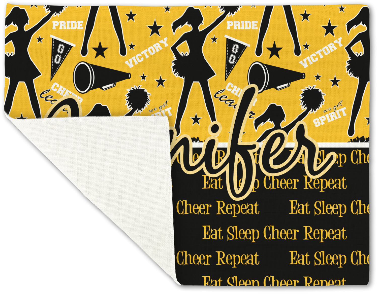 This design is a fun combo with a bright yellow and black. The two colors are a great contrast to one another. The top half of the design has a cheerleader sillhouette as well as words like "cheerleader" and "victory." The bottom half has a background that says eat, sleep, cheer, repeat. Your personalization goes right in between these two backgrounds right in the middle.
