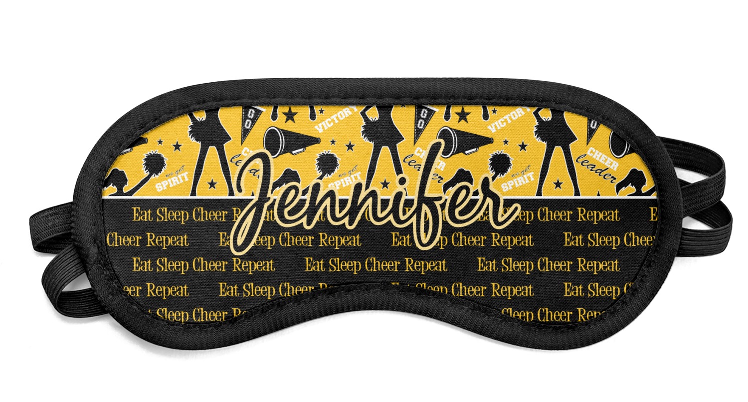 This design is a fun combo with a bright yellow and black. The two colors are a great contrast to one another. The top half of the design has a cheerleader sillhouette as well as words like "cheerleader" and "victory." The bottom half has a background that says eat, sleep, cheer, repeat. Your personalization goes right in between these two backgrounds right in the middle.