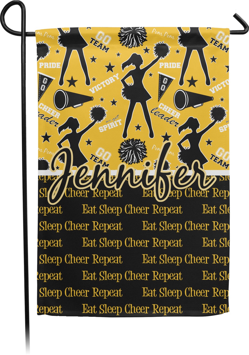 This design is a fun combo with a bright yellow and black. The two colors are a great contrast to one another. The top half of the design has a cheerleader sillhouette as well as words like "cheerleader" and "victory." The bottom half has a background that says eat, sleep, cheer, repeat. Your personalization goes right in between these two backgrounds right in the middle.