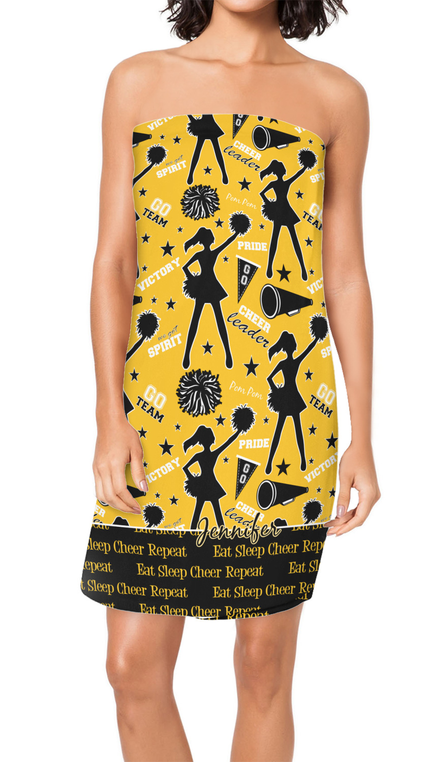 This design is a fun combo with a bright yellow and black. The two colors are a great contrast to one another. The top half of the design has a cheerleader sillhouette as well as words like "cheerleader" and "victory." The bottom half has a background that says eat, sleep, cheer, repeat. Your personalization goes right in between these two backgrounds right in the middle.