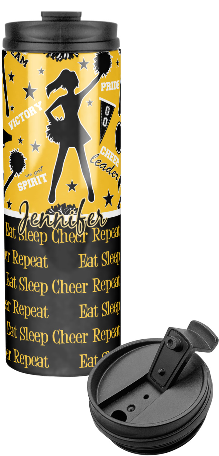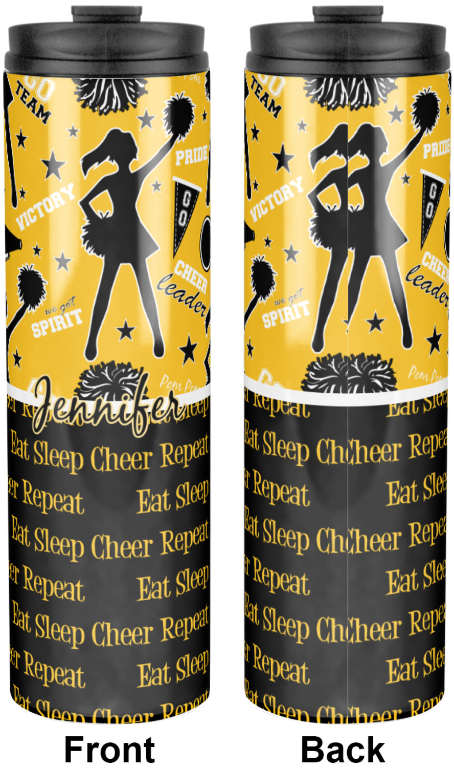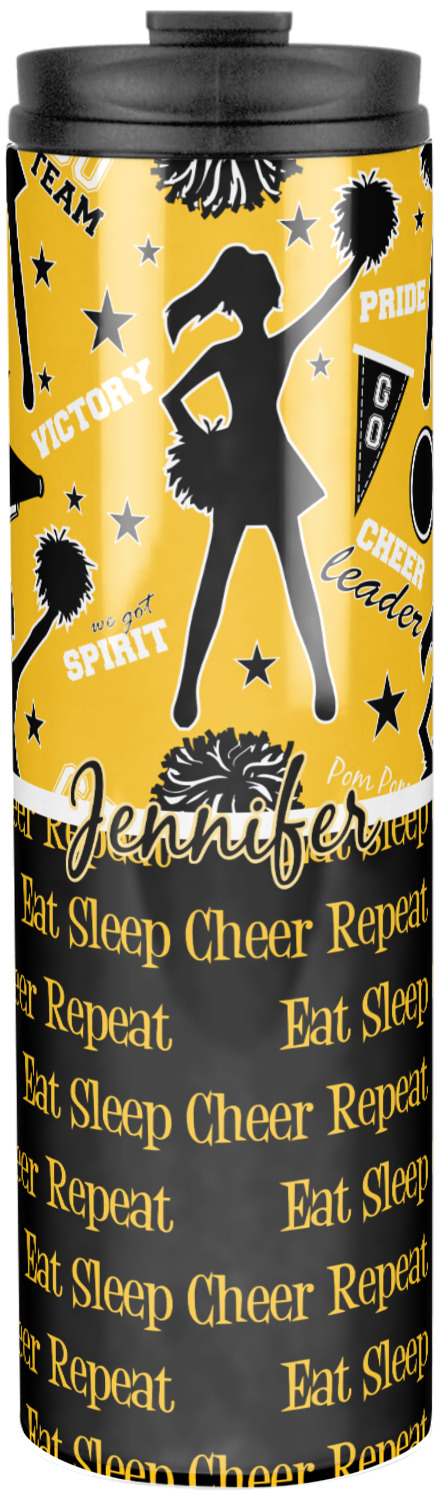 This design is a fun combo with a bright yellow and black. The two colors are a great contrast to one another. The top half of the design has a cheerleader sillhouette as well as words like "cheerleader" and "victory." The bottom half has a background that says eat, sleep, cheer, repeat. Your personalization goes right in between these two backgrounds right in the middle.