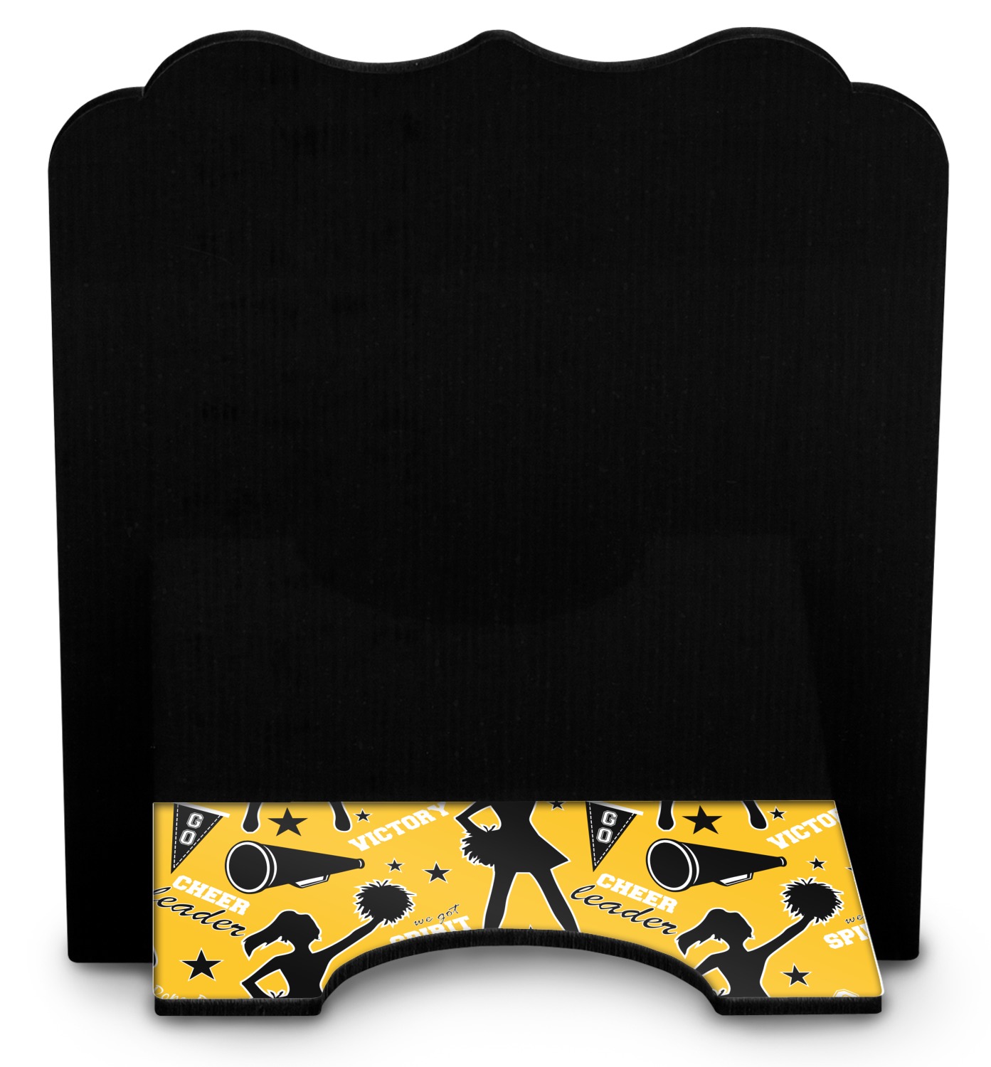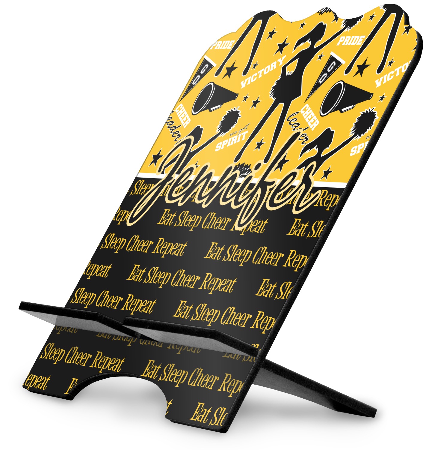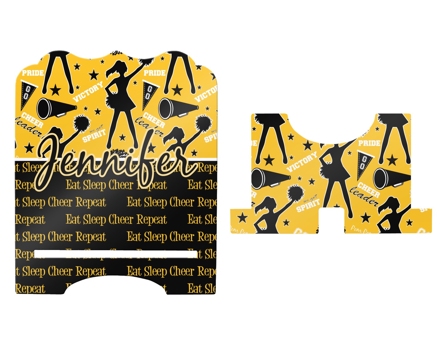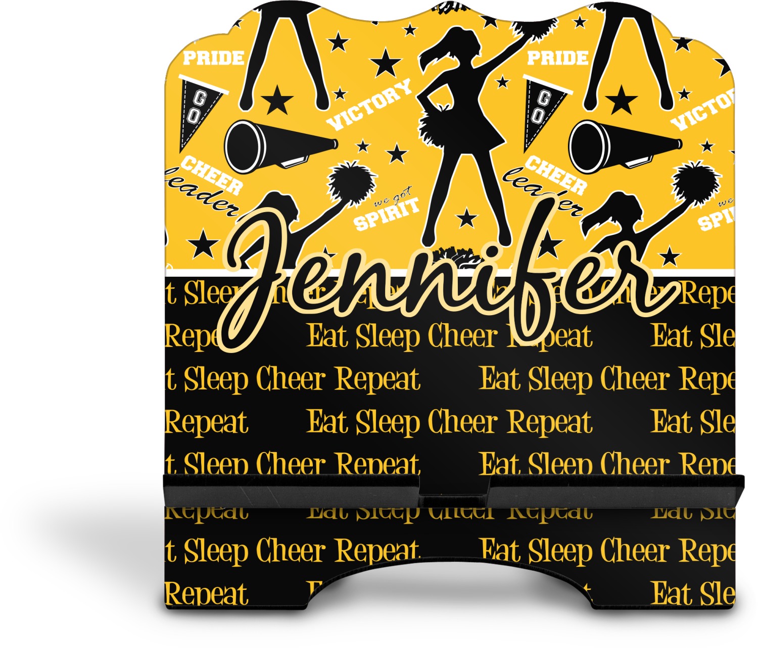 This design is a fun combo with a bright yellow and black. The two colors are a great contrast to one another. The top half of the design has a cheerleader sillhouette as well as words like "cheerleader" and "victory." The bottom half has a background that says eat, sleep, cheer, repeat. Your personalization goes right in between these two backgrounds right in the middle.