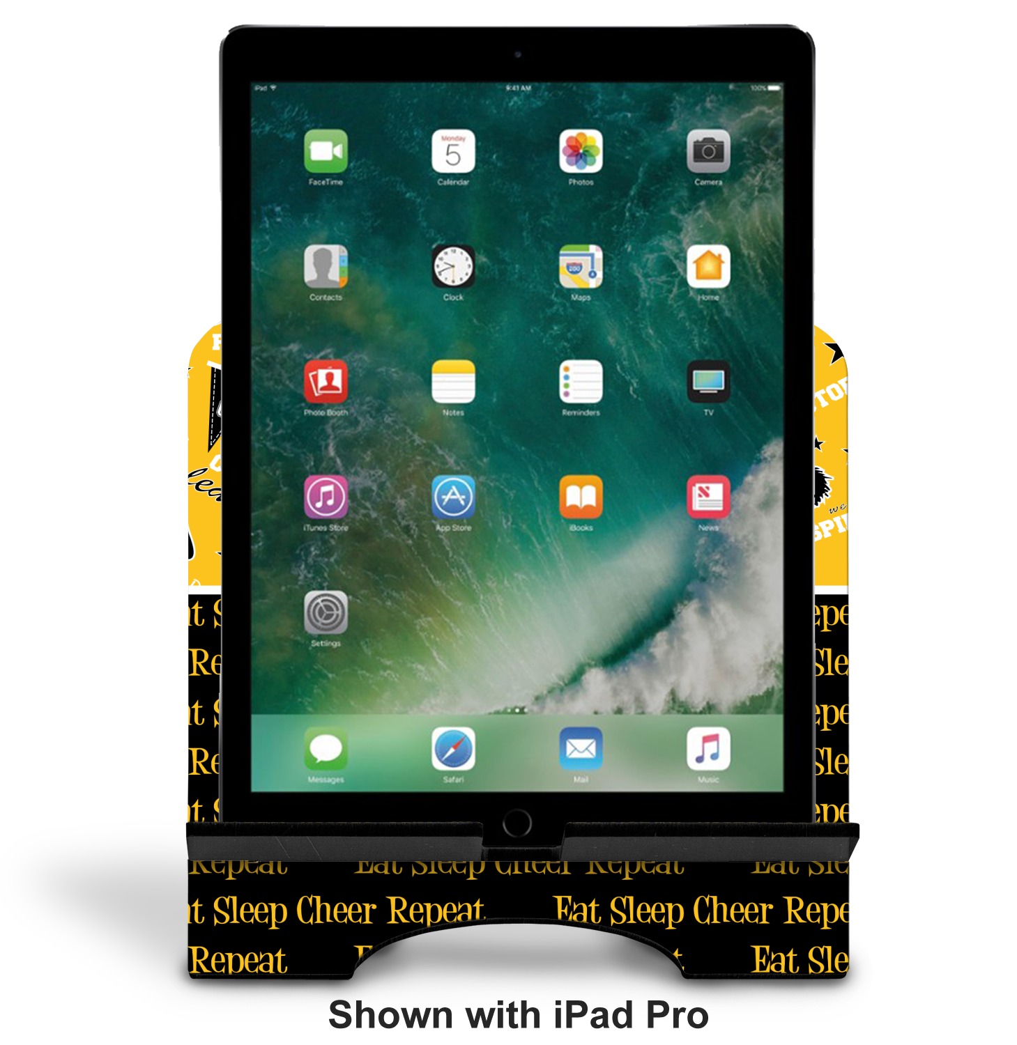 The stand is comprised of two hardboard pieces that fit snugly together and stabilize one another. The bottom part of the iPad stand supports your tablet, and has space for your tablets charger while in use. At 9.25" x 11.5", this tablet mount can support a device between the sizes of the iPad Pro and the iPad Mini 2. The uppermost part of the stand features a decorative, curved edge for a classy, suave appearance. We print your customization atop the face of the stand, in vibrant color. The remaining sides are colored a sleek black.