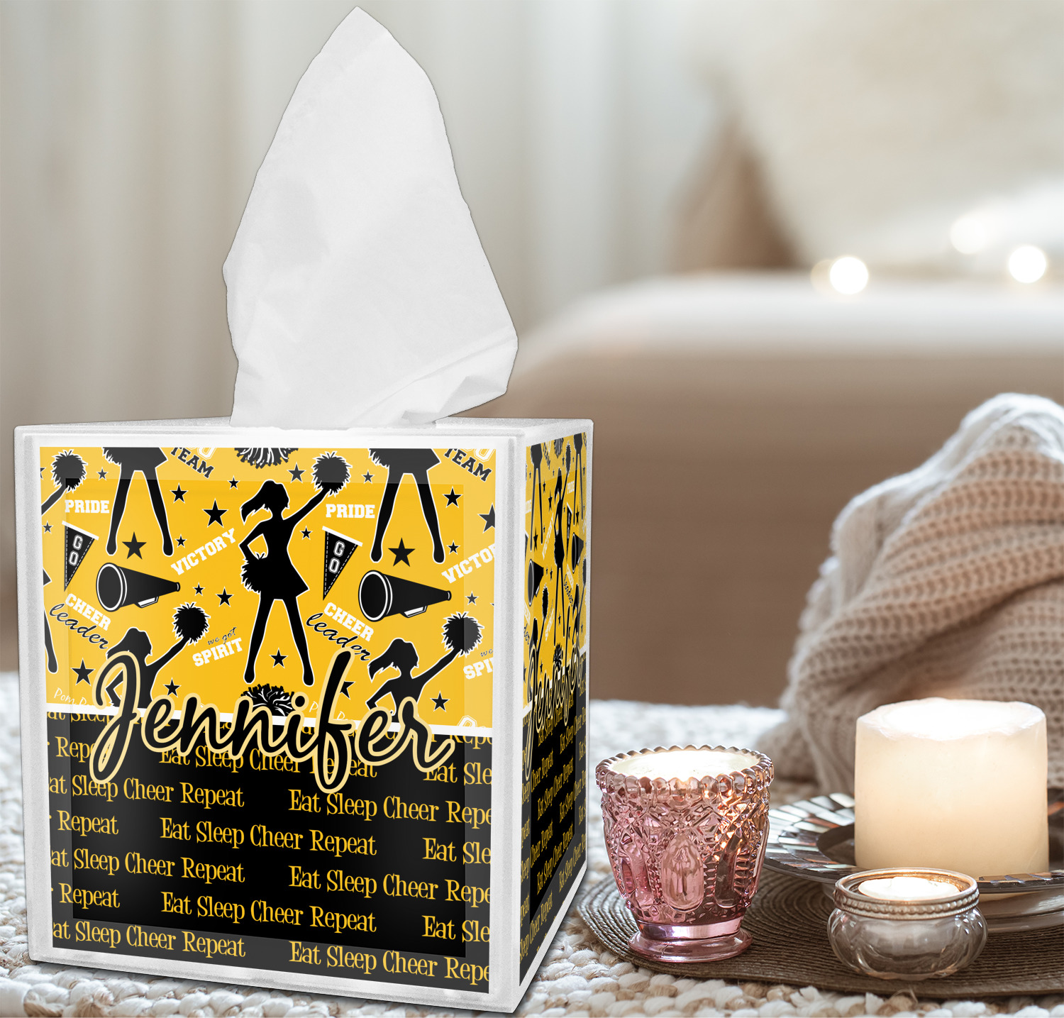 These tissue holders are built from durable acrylic and display your unique personalization on fine-quality vinyl inserts placed within the four sides and top. The box features two pieces, allowing you to easily switch out tissue boxes. On the sides, youll find ridges that ensure the top and base fit securely in place. The bottom of these tissue box holders has four, rubber, non-slip pads to prevent the box from scuffing any surface you decide to display it on. Each box can fit a standard 5 by 5-inch box of tissues.