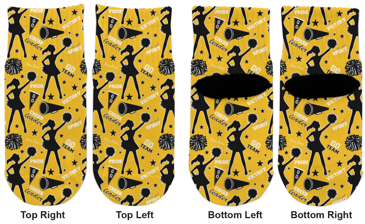 This design is a fun combo with a bright yellow and black. The two colors are a great contrast to one another. The top half of the design has a cheerleader sillhouette as well as words like "cheerleader" and "victory." The bottom half has a background that says eat, sleep, cheer, repeat. Your personalization goes right in between these two backgrounds right in the middle.