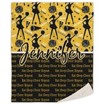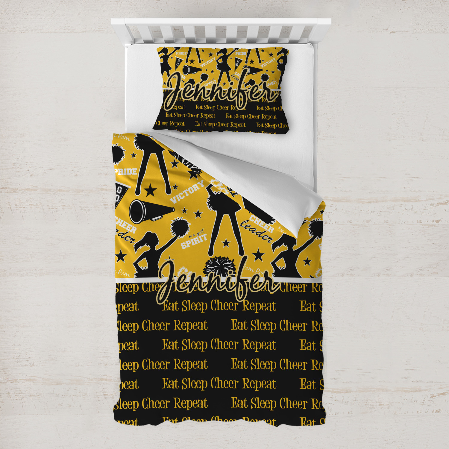 This design is a fun combo with a bright yellow and black. The two colors are a great contrast to one another. The top half of the design has a cheerleader sillhouette as well as words like "cheerleader" and "victory." The bottom half has a background that says eat, sleep, cheer, repeat. Your personalization goes right in between these two backgrounds right in the middle.