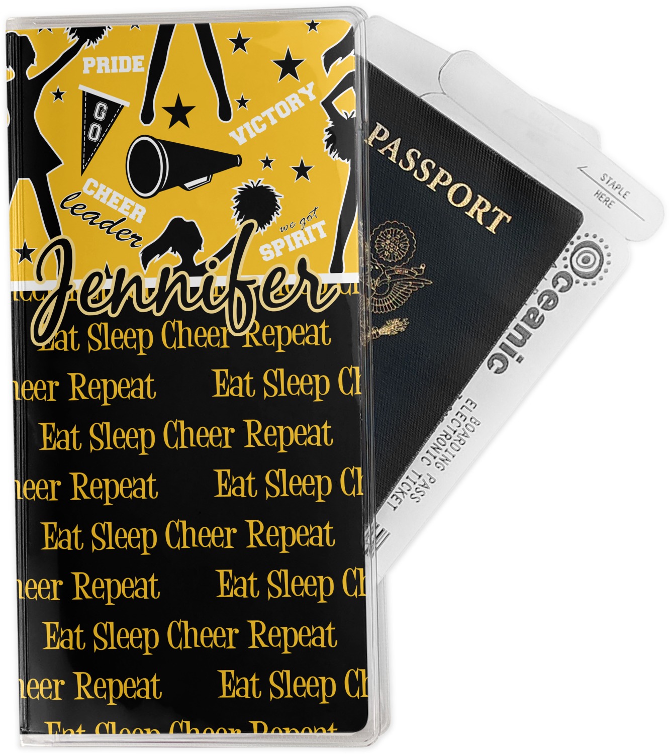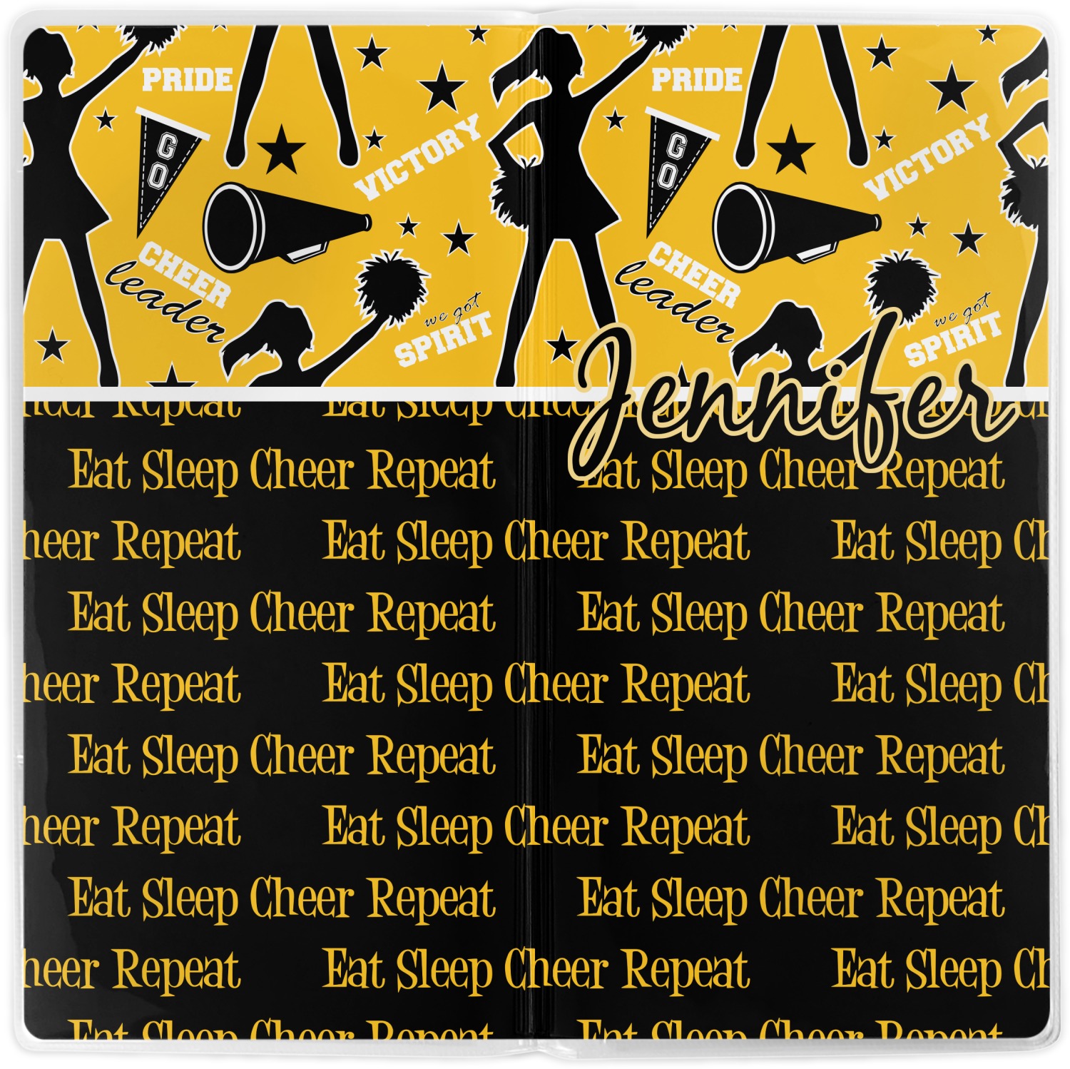 This design is a fun combo with a bright yellow and black. The two colors are a great contrast to one another. The top half of the design has a cheerleader sillhouette as well as words like "cheerleader" and "victory." The bottom half has a background that says eat, sleep, cheer, repeat. Your personalization goes right in between these two backgrounds right in the middle.